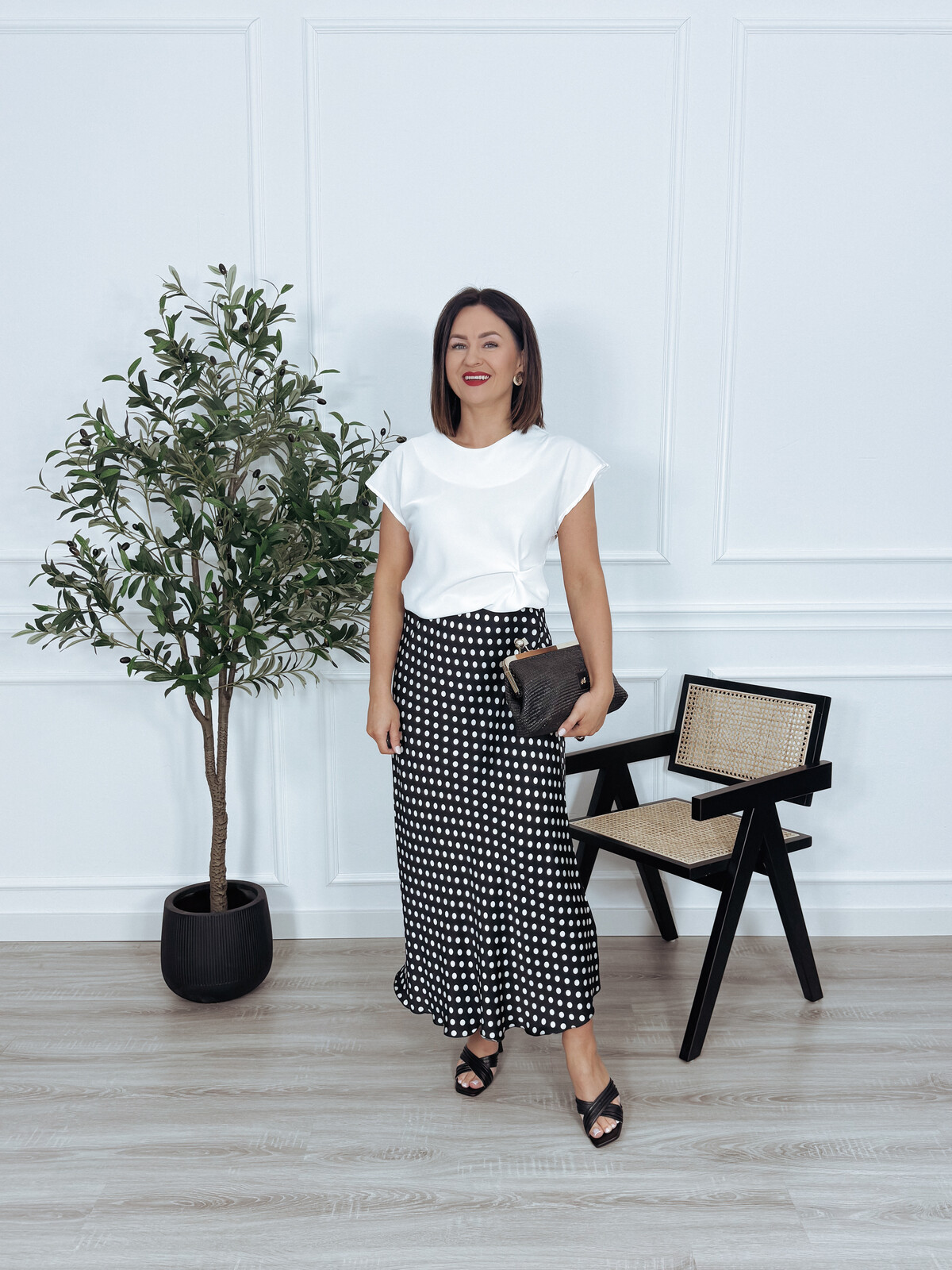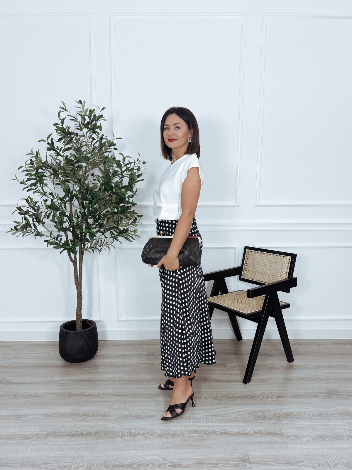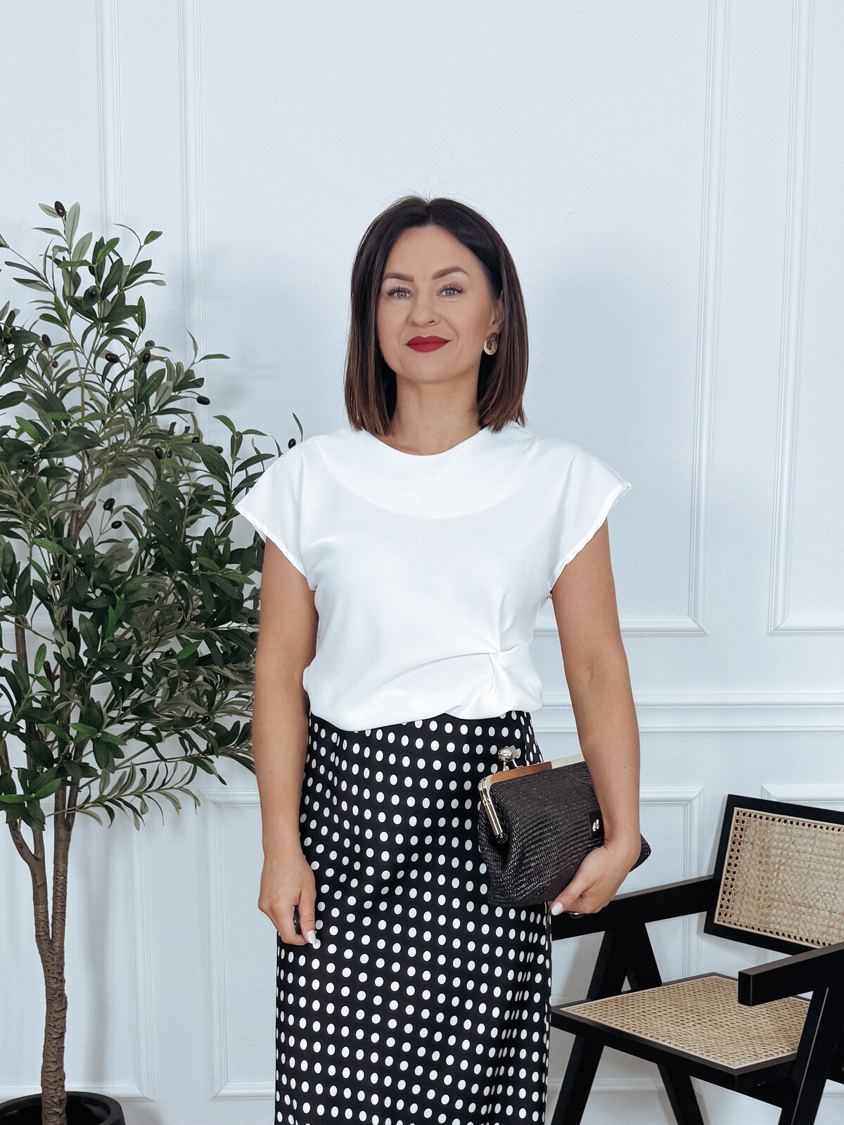 Gładka bluzka z zapięciem z tyłu na guzik. Z przodu ciekawe marszczenie materiału.🖤