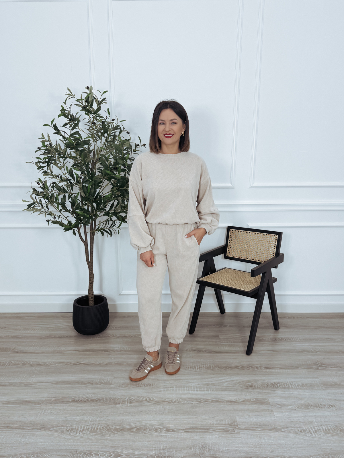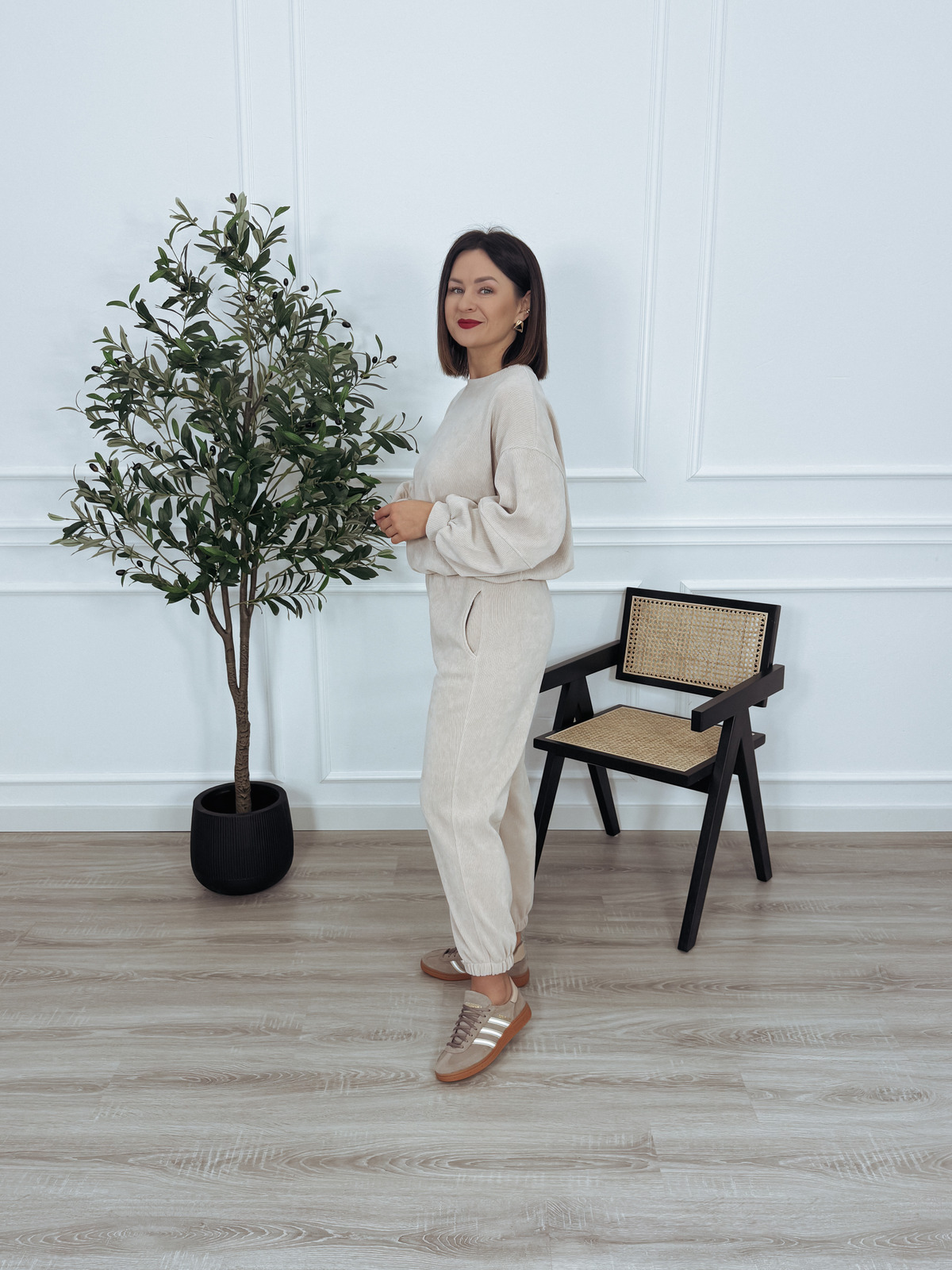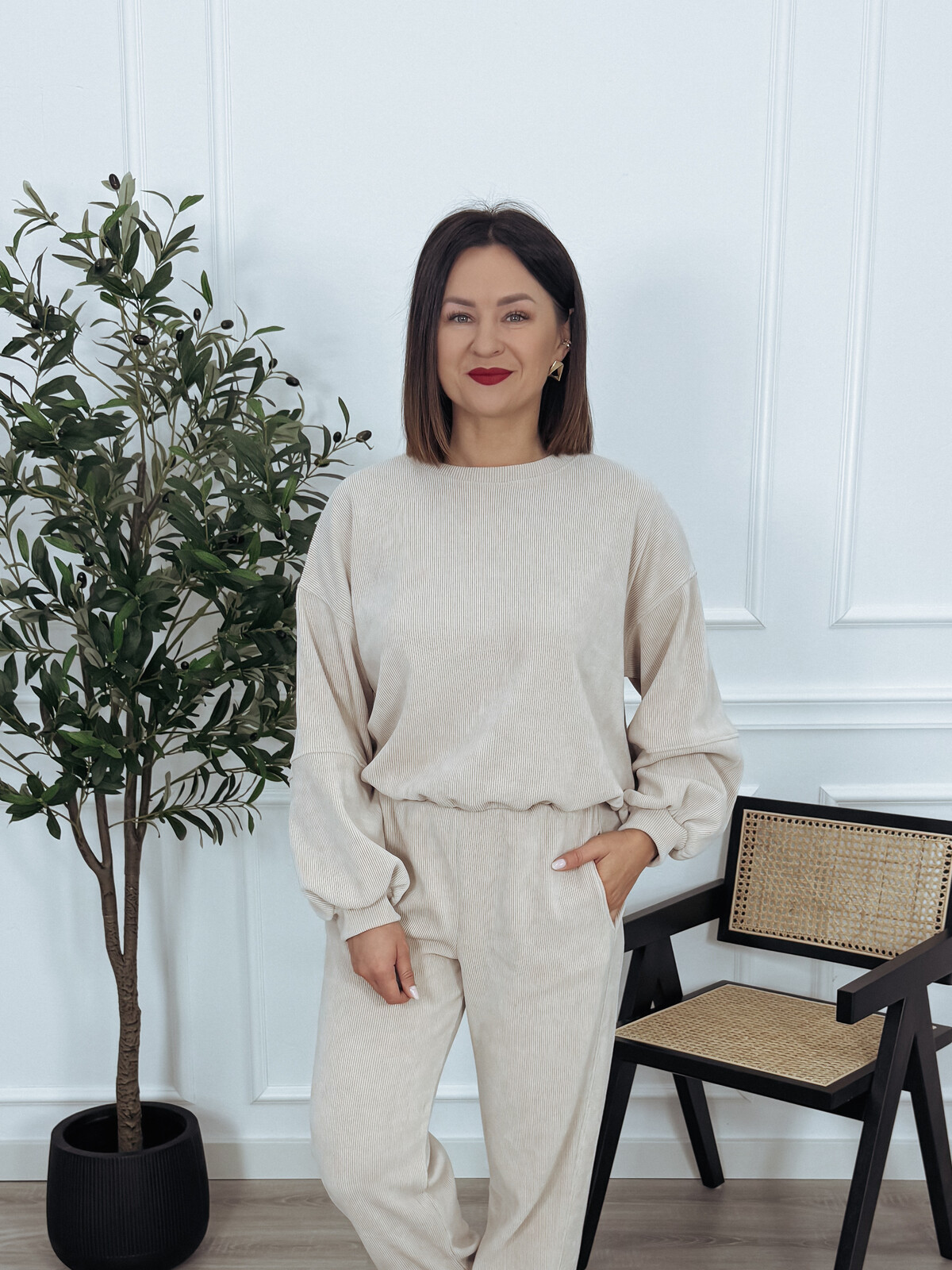 Bardzo wygodny komplet składający się z bluzy oraz spodni. Bluza posiada sciągacz na dole, a spodnie elastyczną gumkę w pasie i wiązanie. Materiał w prążek🖤