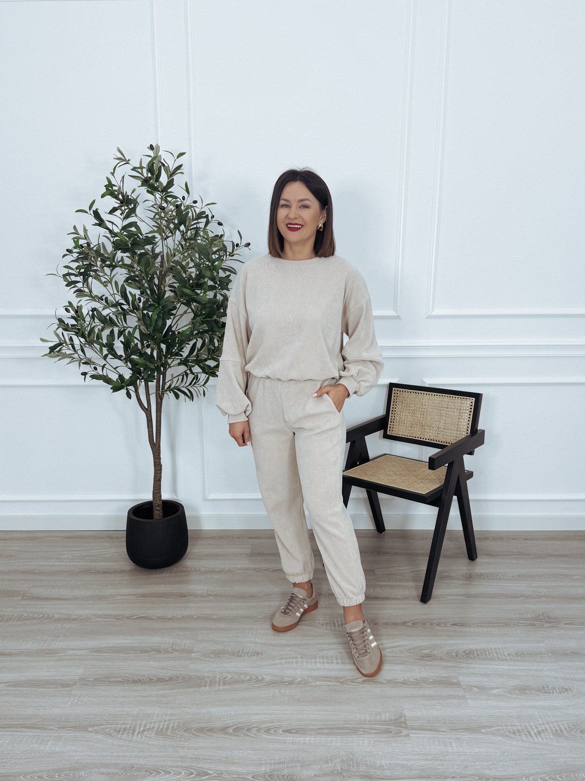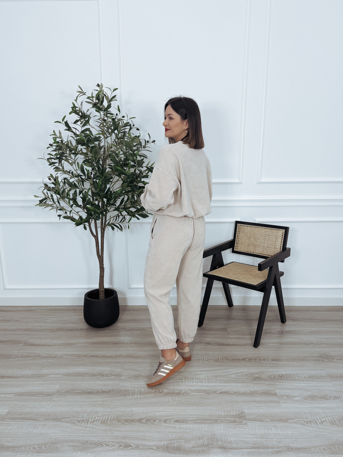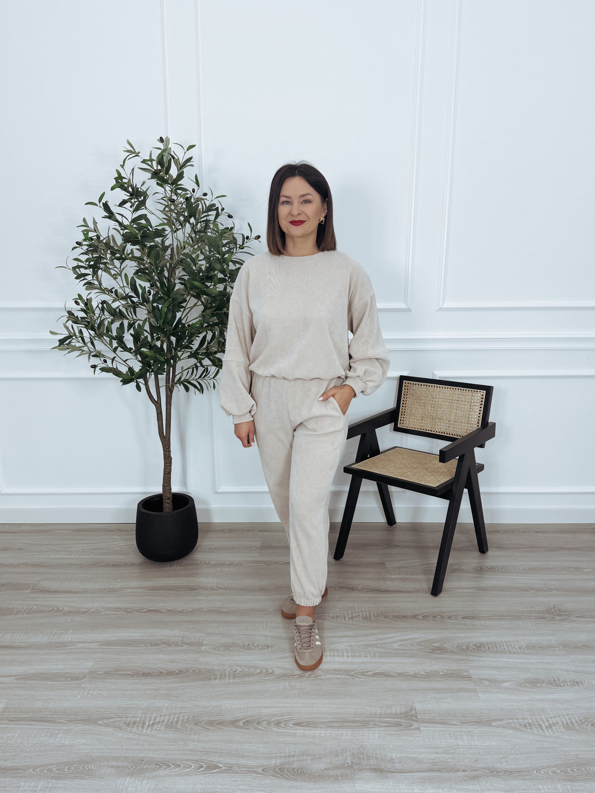 Bardzo wygodny komplet składający się z bluzy oraz spodni. Bluza posiada sciągacz na dole, a spodnie elastyczną gumkę w pasie i wiązanie. Materiał w prążek🖤