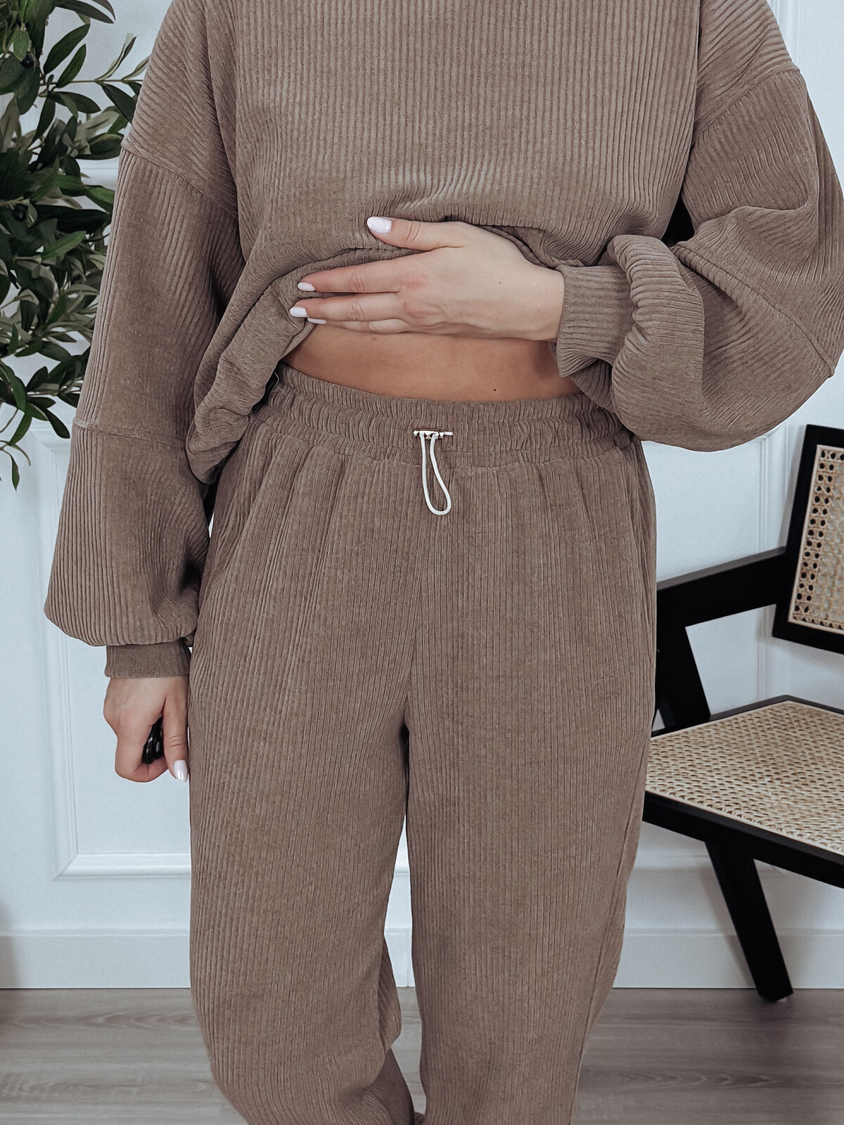 Bardzo wygodny komplet składający się z bluzy oraz spodni. Bluza posiada sciągacz na dole, a spodnie elastyczną gumkę w pasie i wiązanie. Materiał w prążek🖤