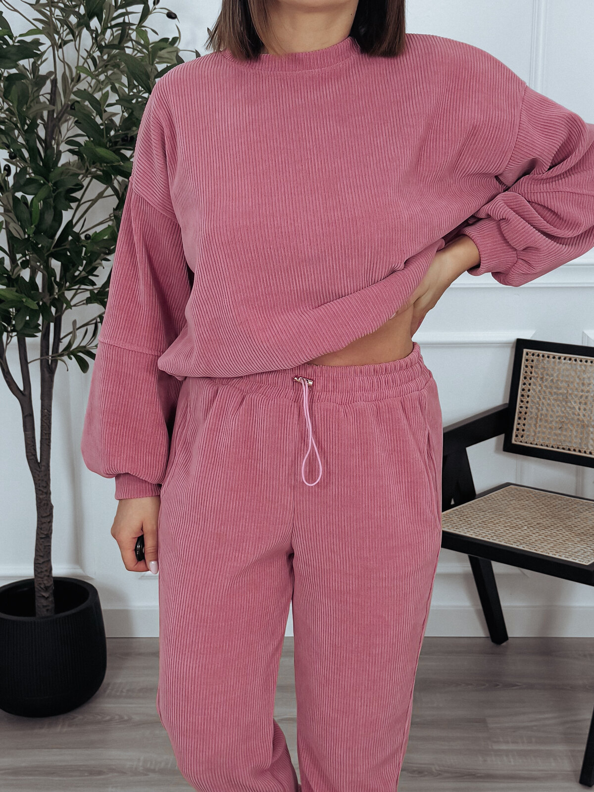 Bardzo wygodny komplet składający się z bluzy oraz spodni. Bluza posiada sciągacz na dole, a spodnie elastyczną gumkę w pasie i wiązanie. Materiał w prążek🖤