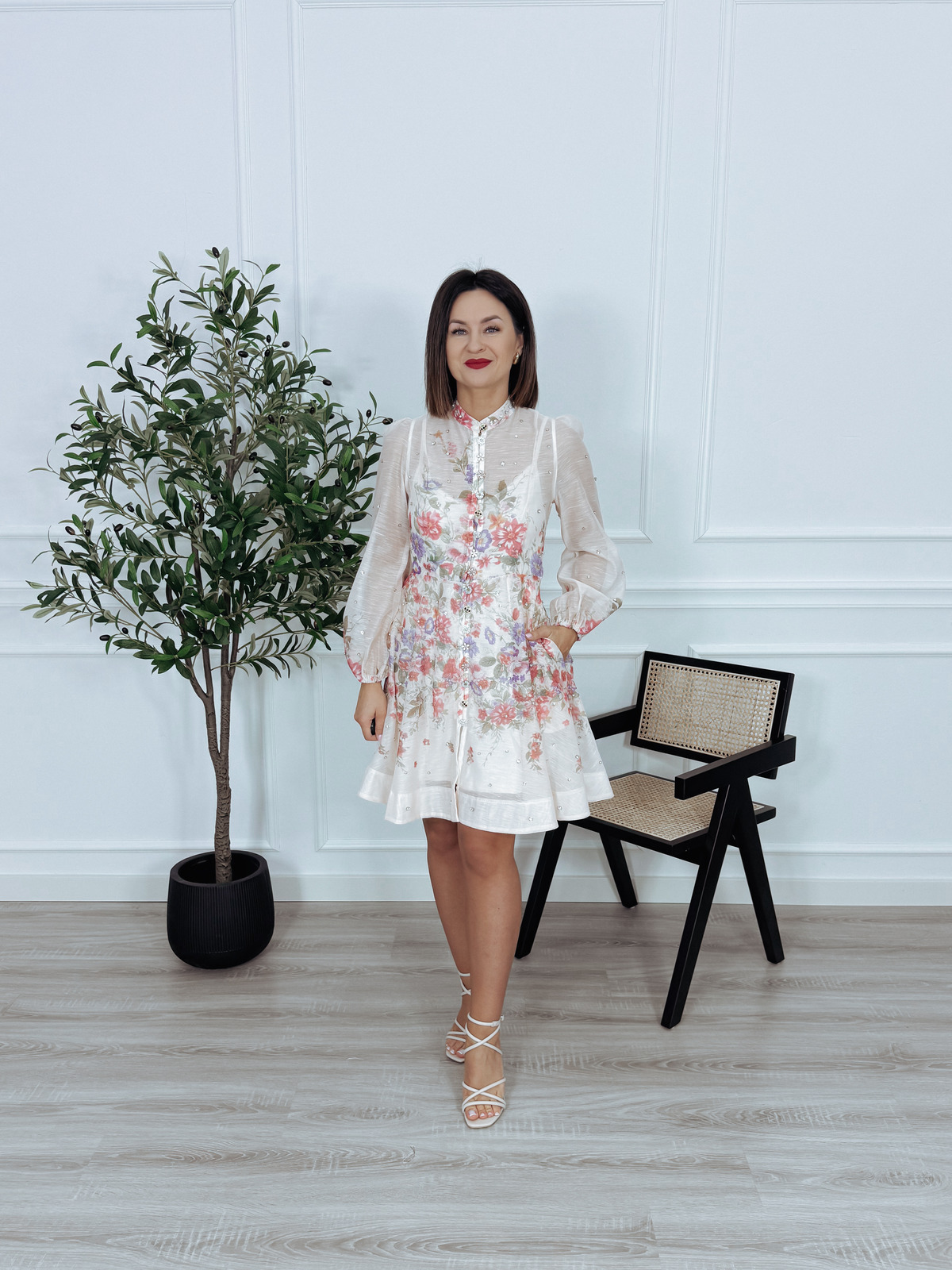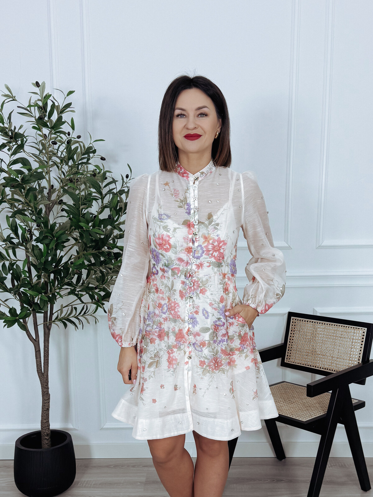 Elegancka sukienka z długim rękawem, zapinana z przodu na ozdobne, biżuteryjne guziki, z praktycznymi kieszeniami po bokach. Model posiada także zapięcie z tyłu na zamek oraz halkę z elastycznego materiału oraz pasek wykonany z tego samego materiału co sukienka.🖤