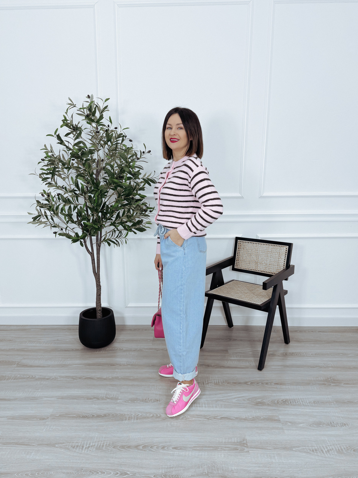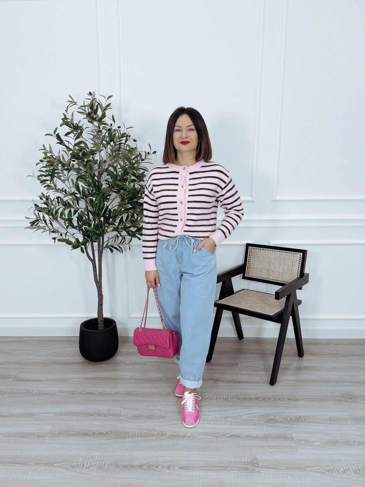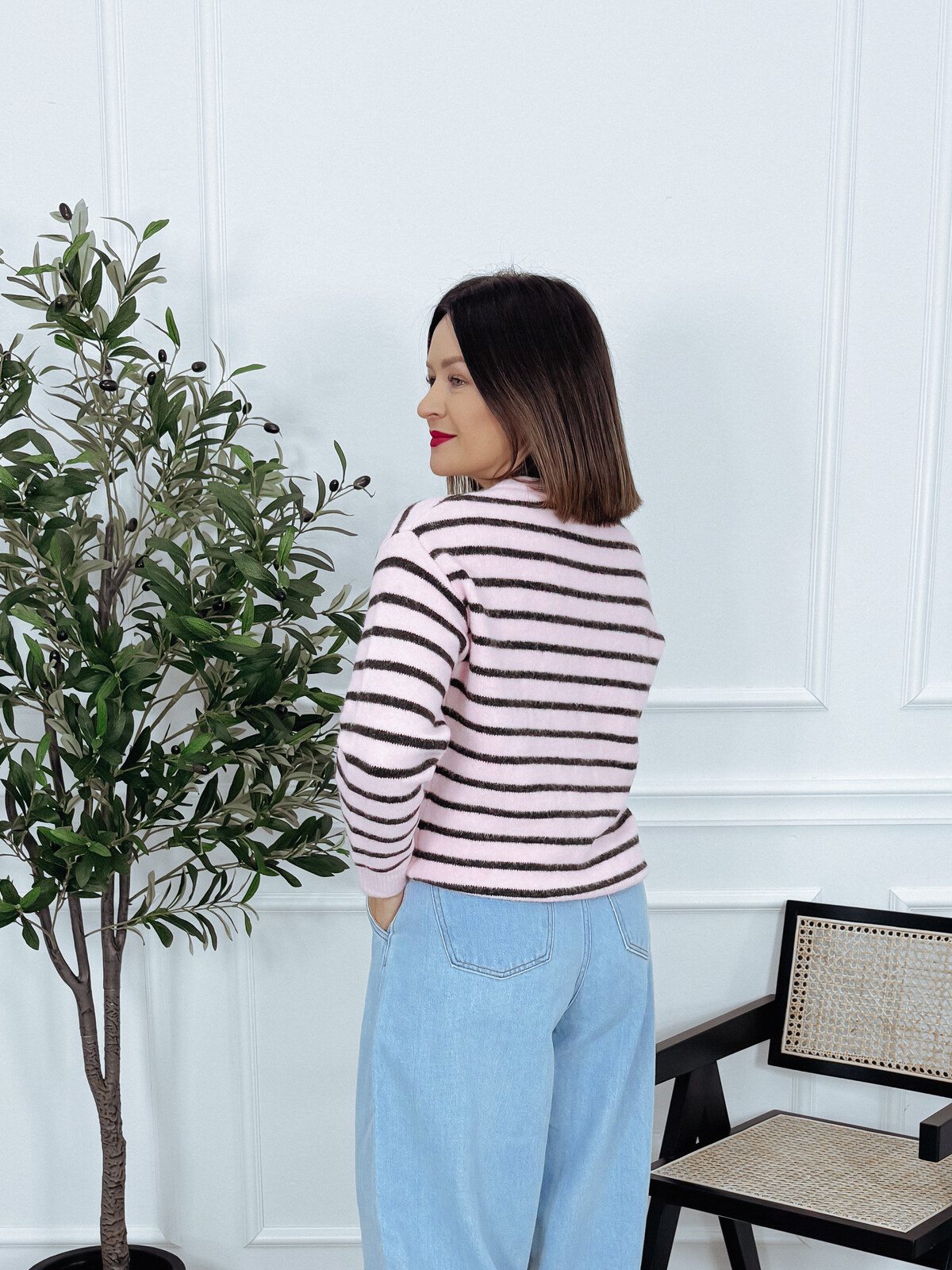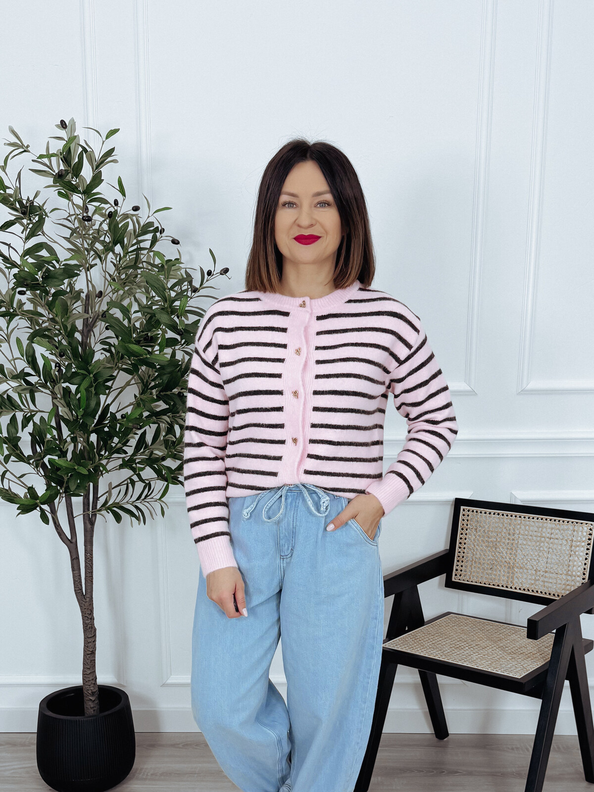 Ponadczasowy, elegancki sweter w paski. Fason kardiganu, zapinany na ozdobne guziki w kształcie serduszek. 🖤