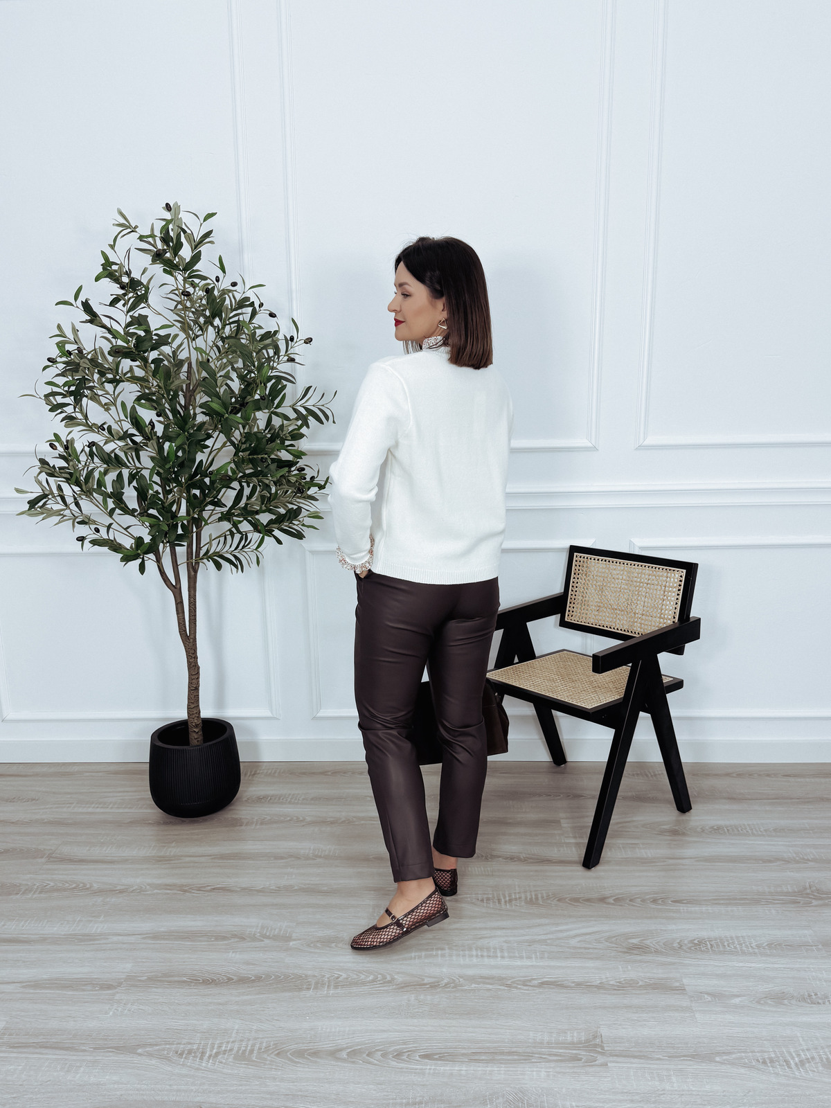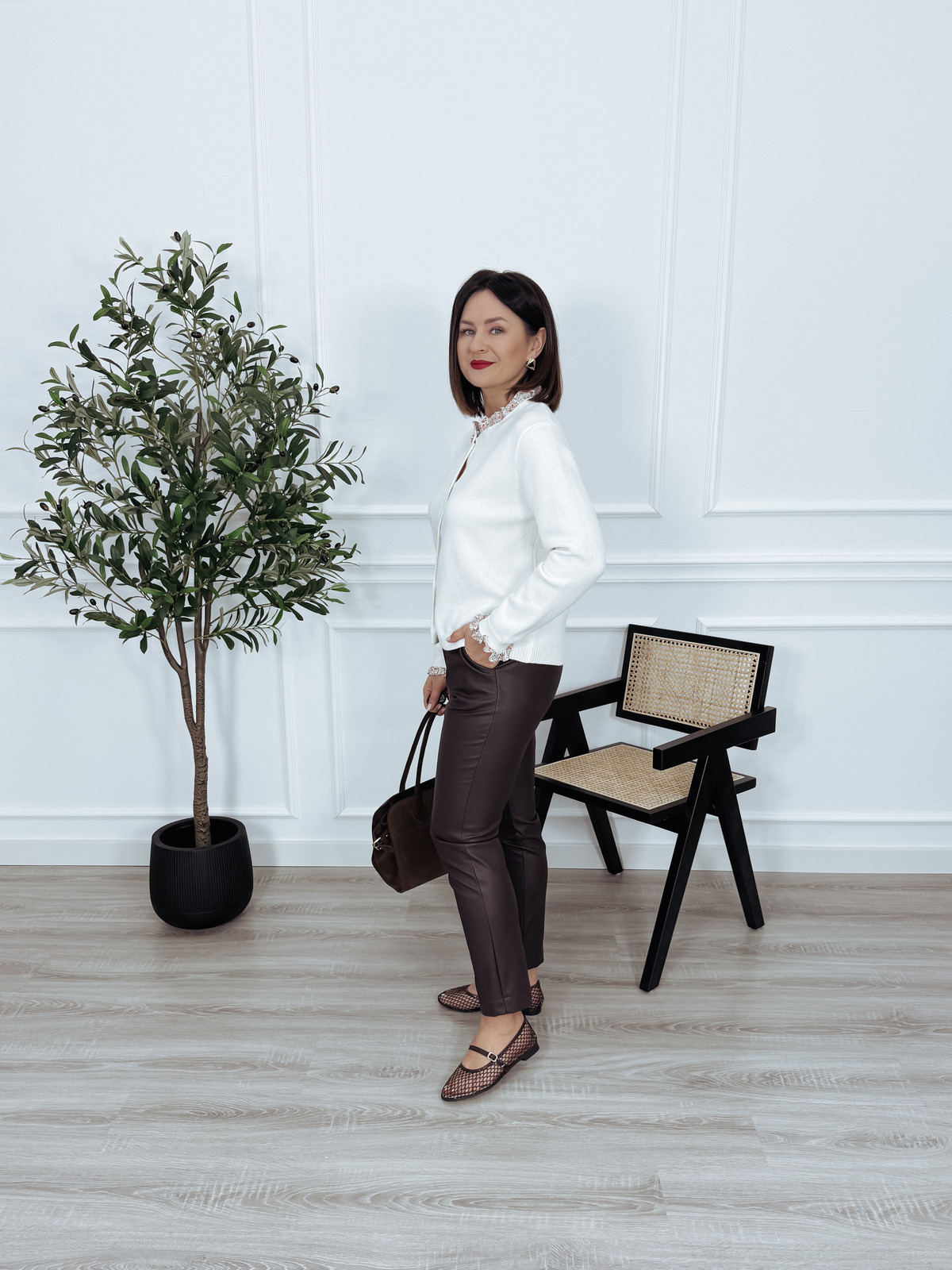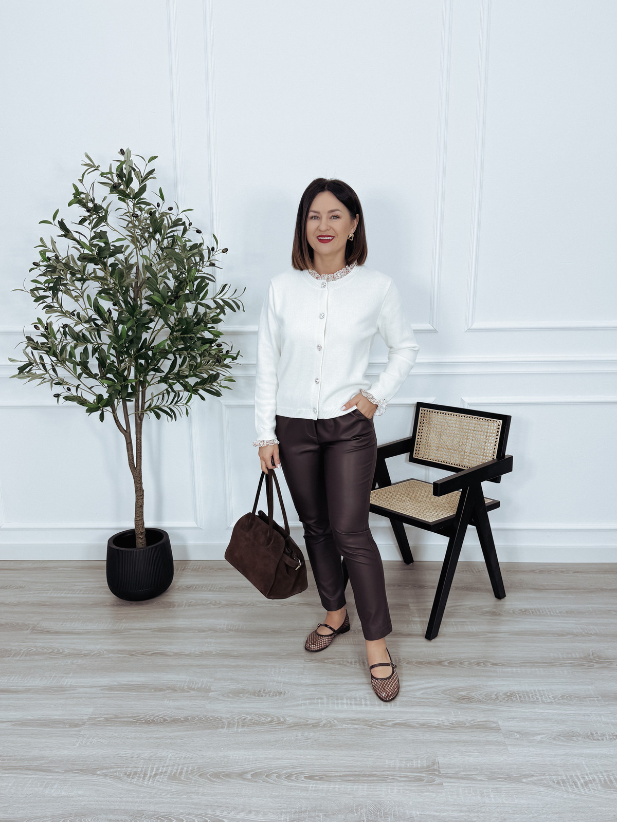 Uroczy kardigan z falbanką w drobne kwiatuszki na kołnierzu i rękawach. Zapinany z przodu na guziki. 🖤