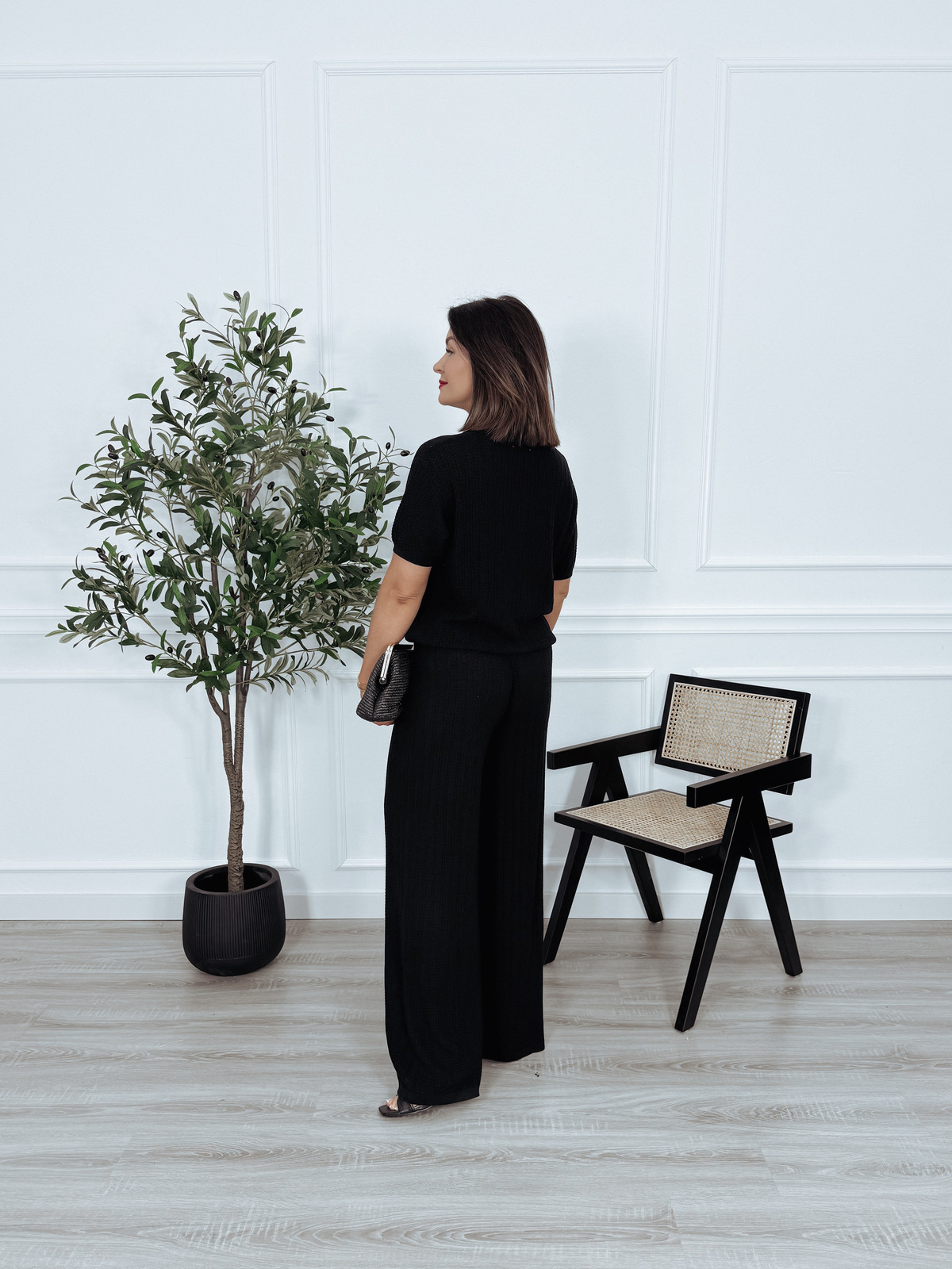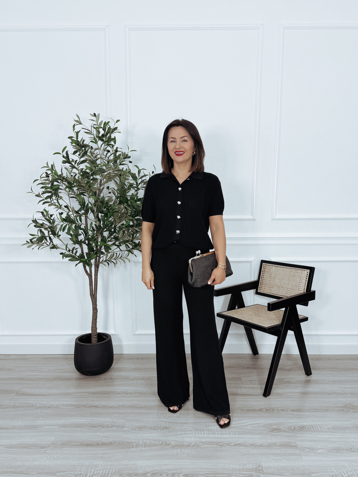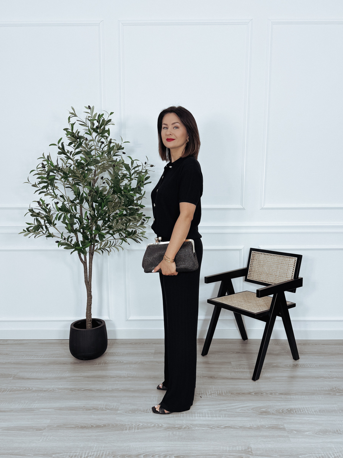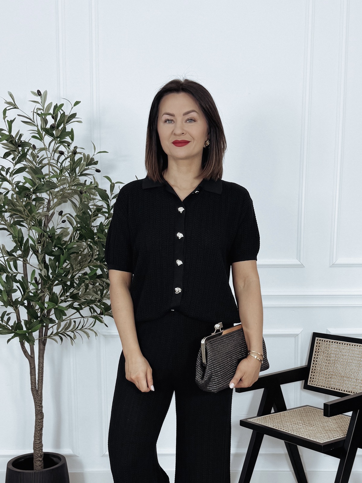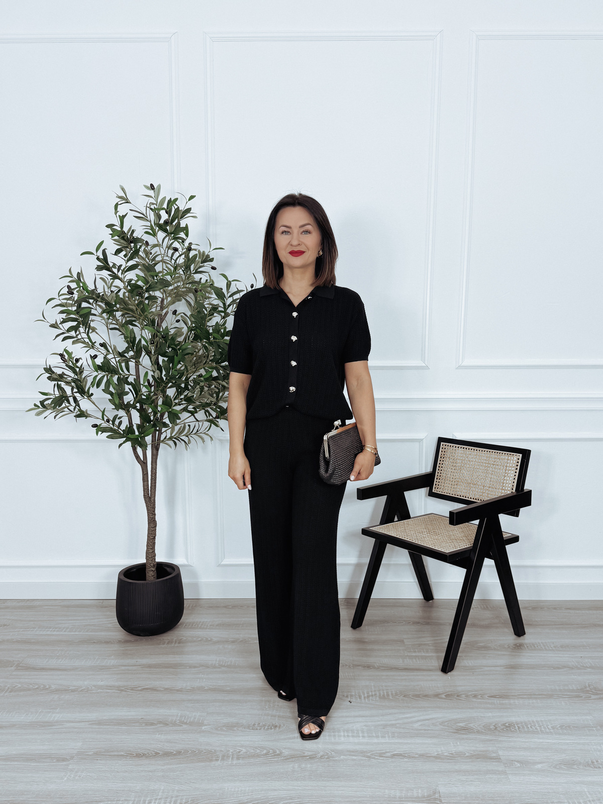 Bardzo wygodny komplet dzianinowy składający się z bluzki ze złotymi guzikami oraz spodni z szeroką nogawką z gumką w pasie. W tym komplecie będziesz wyglądała modnie i stylowo🖤