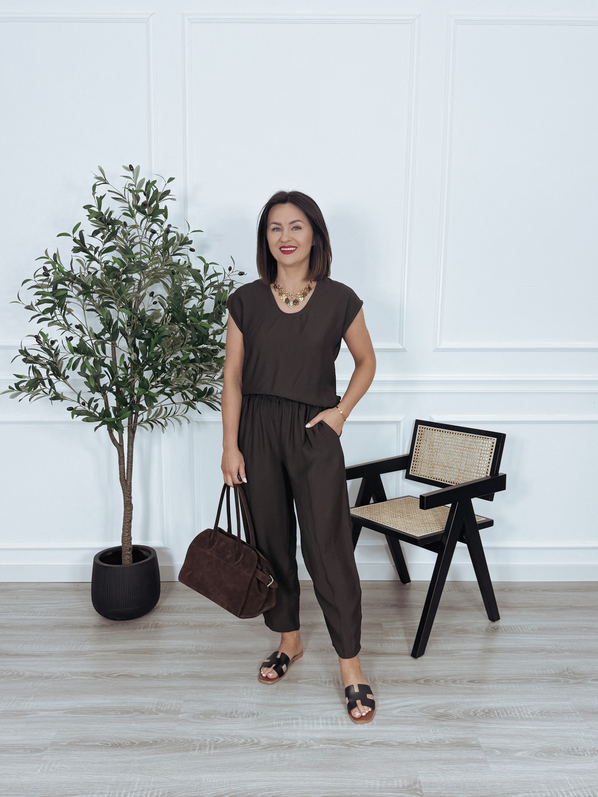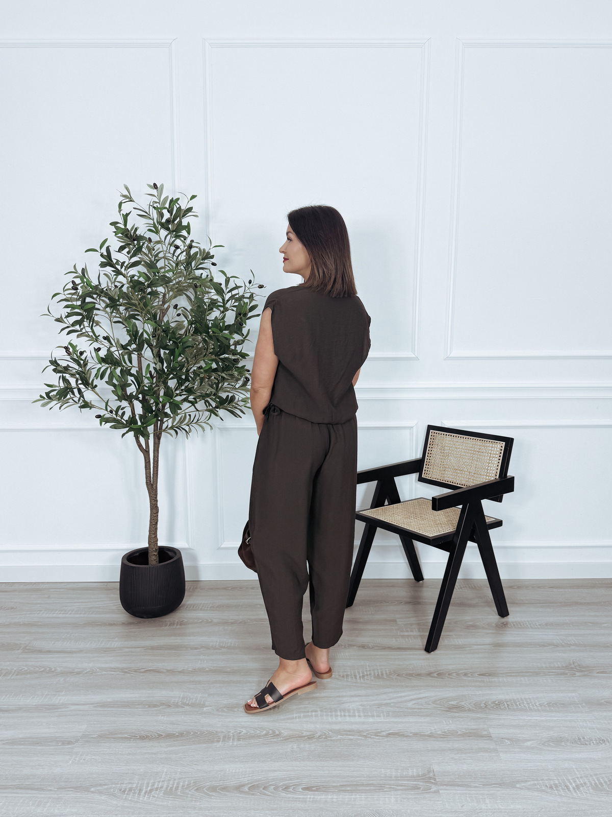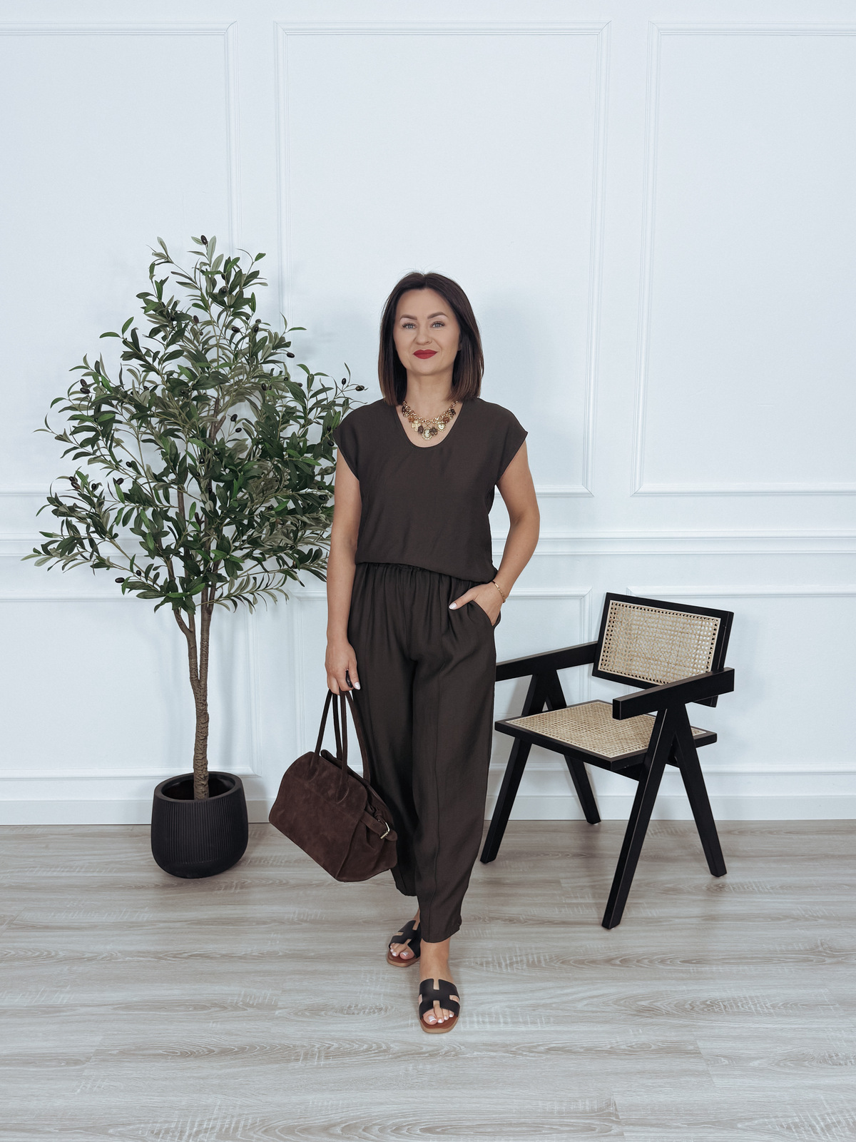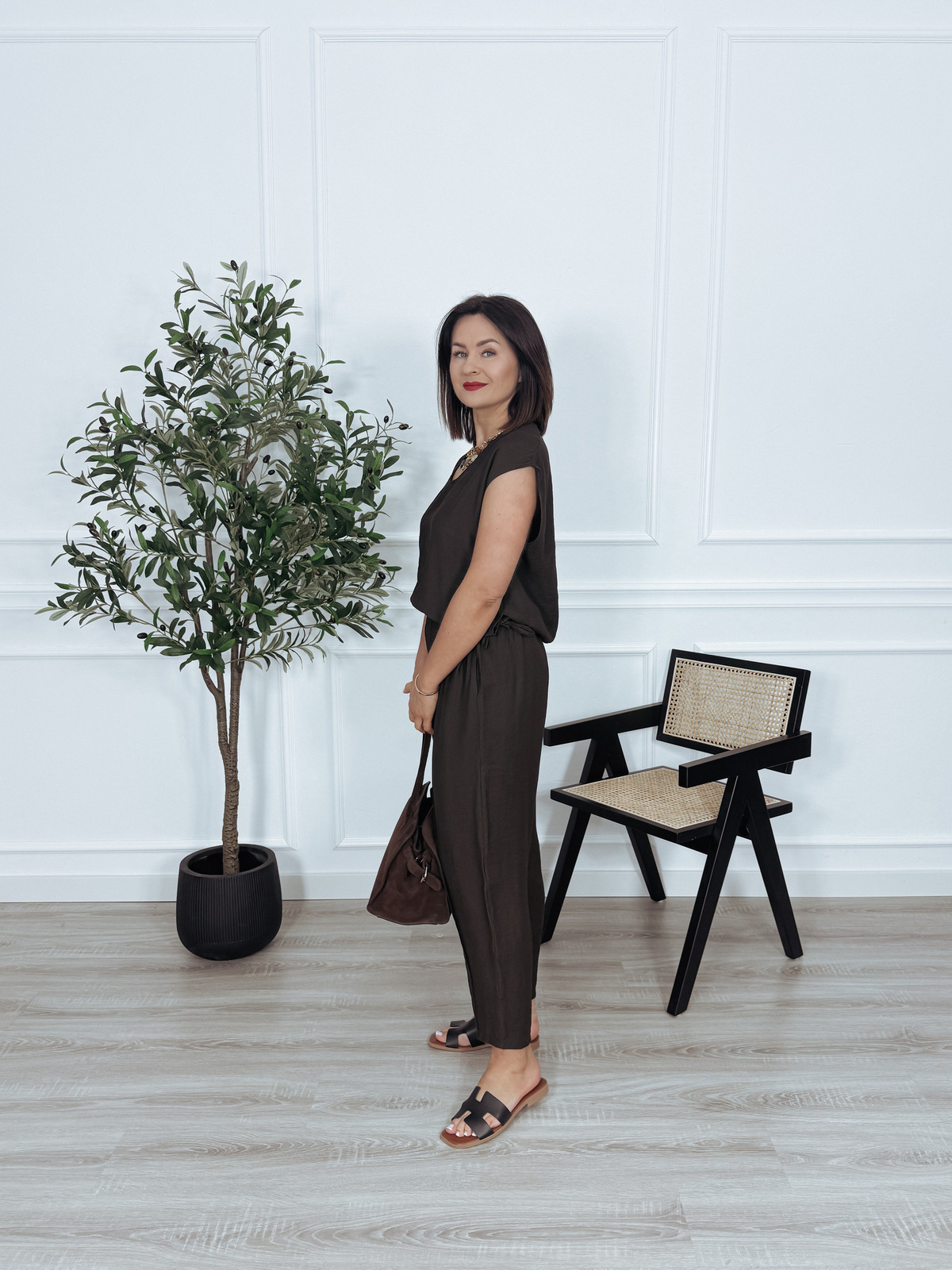 Komplet bluzka bez rękawów + spodnie balloony gorzka czekolada BAROZZI