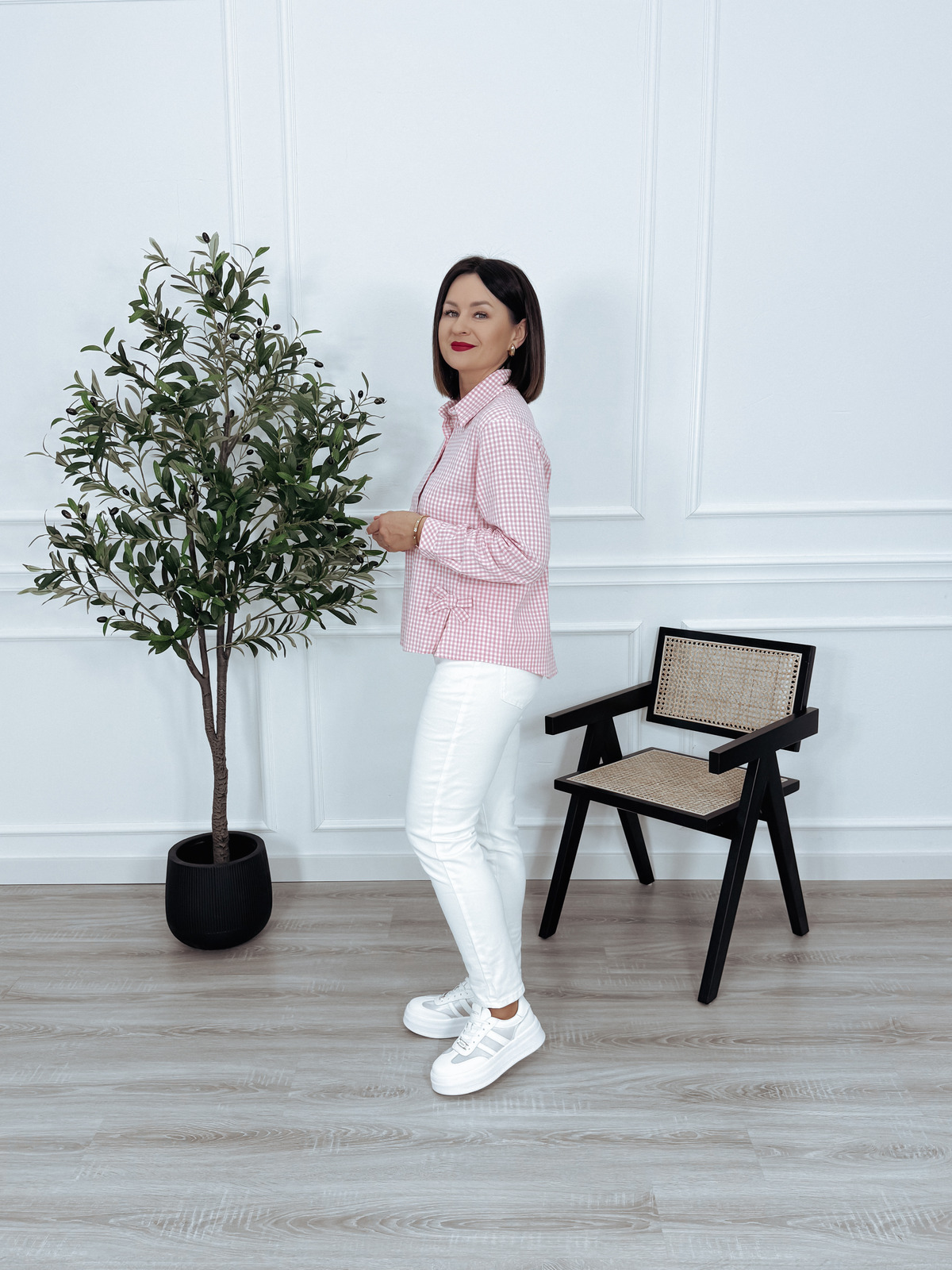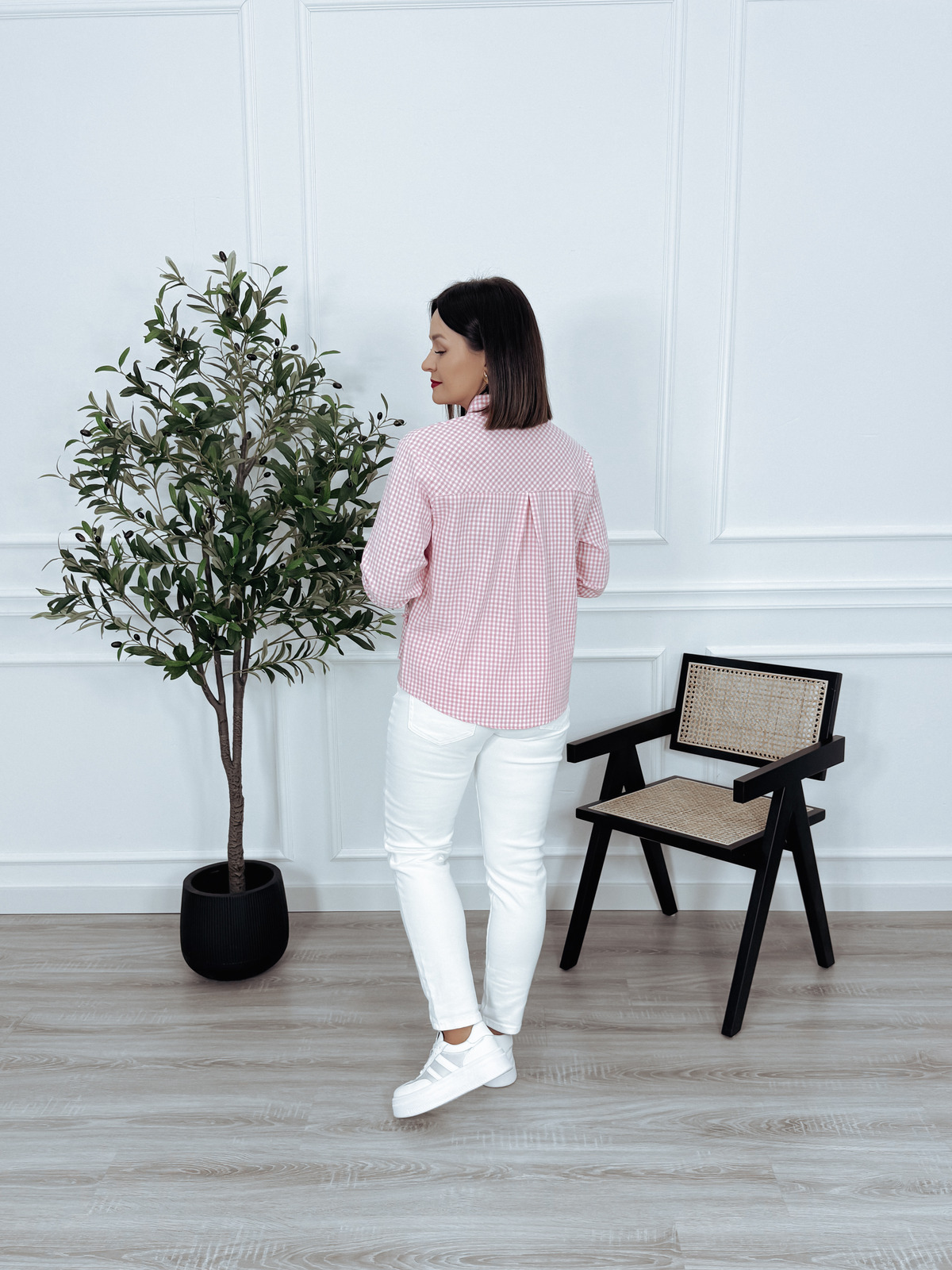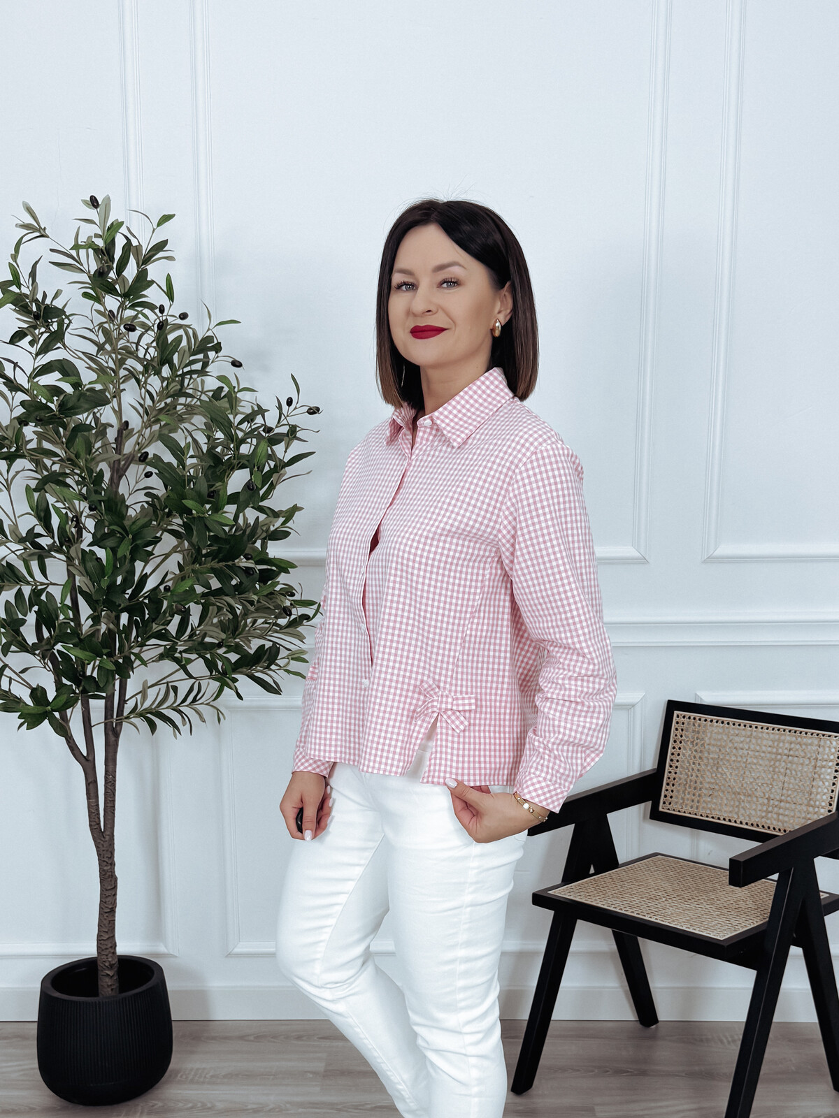 Koszula z bawełny asymetryczna z kokardkami po bokach różowo-biała CANNY