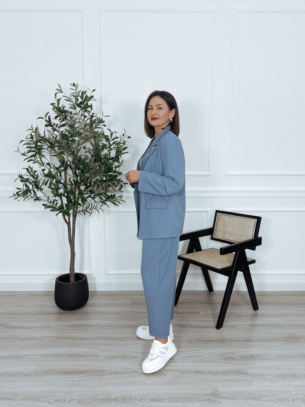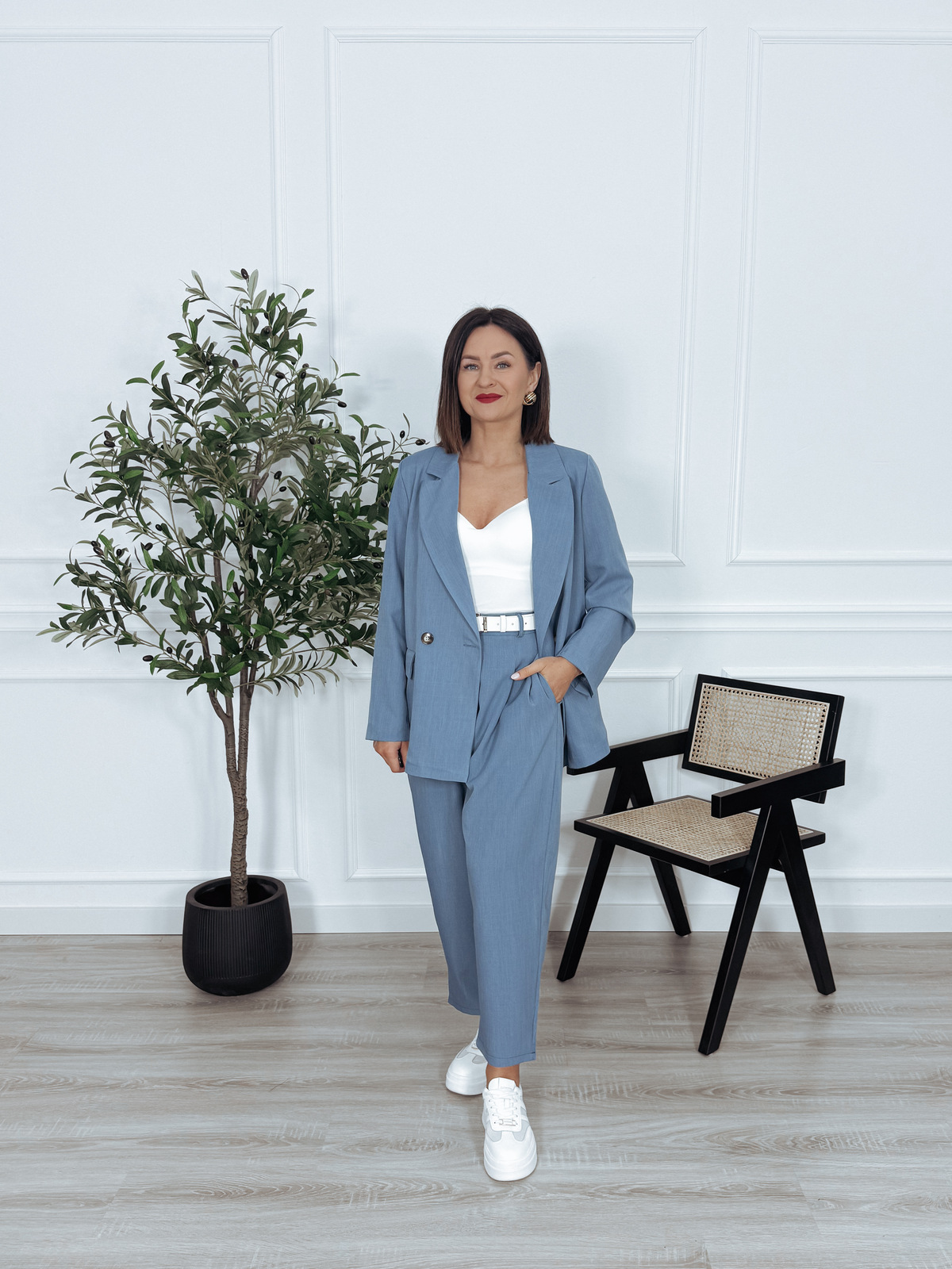 Klasyczna, bardzo stylowa marynarka na podszewce zapinana na guzik. Posiada proste rękawy z poduszkami na ramionach oraz kieszenie po bokach. Będzie pasować do każdej stylizacji.  Model luźniejszy, dłuższy 🖤