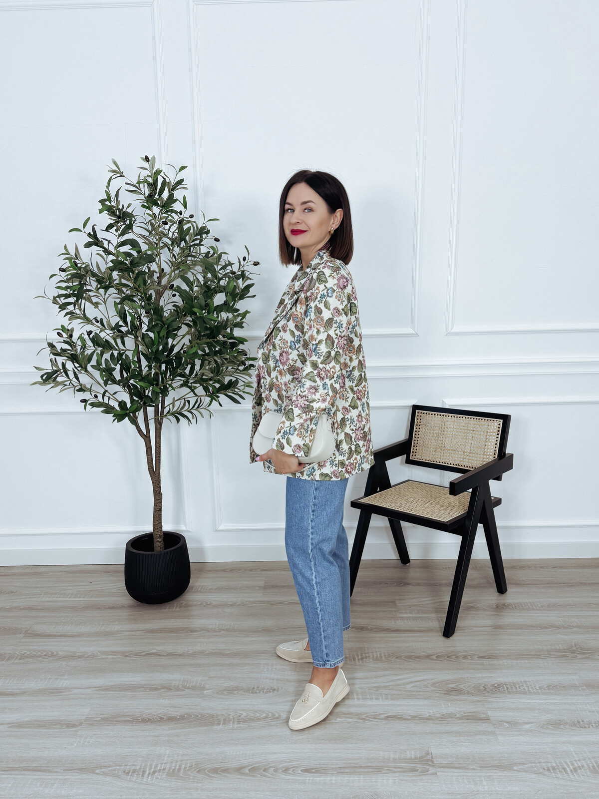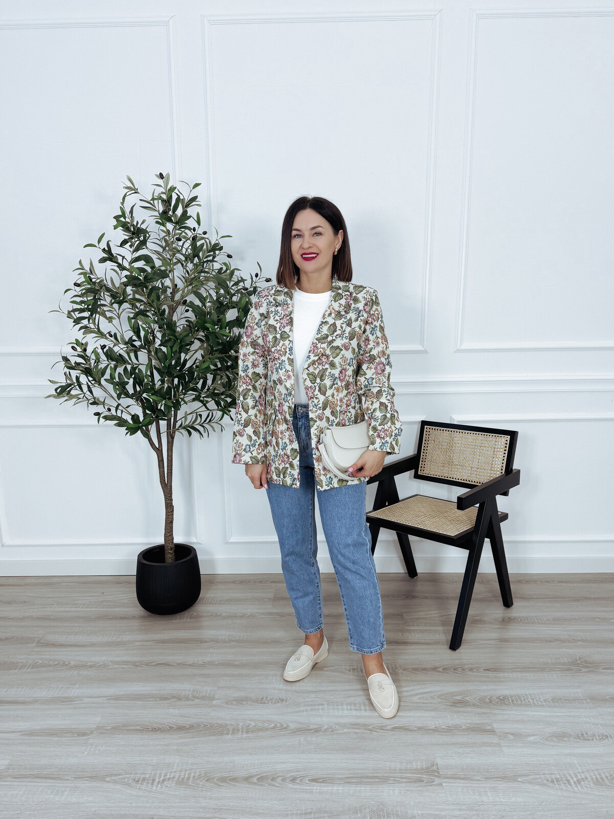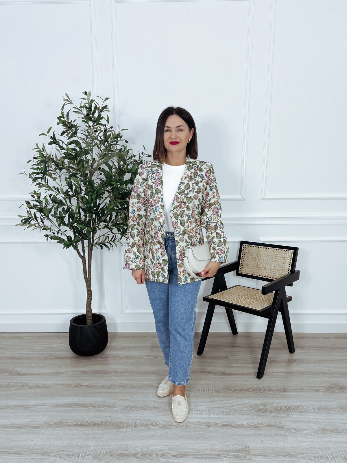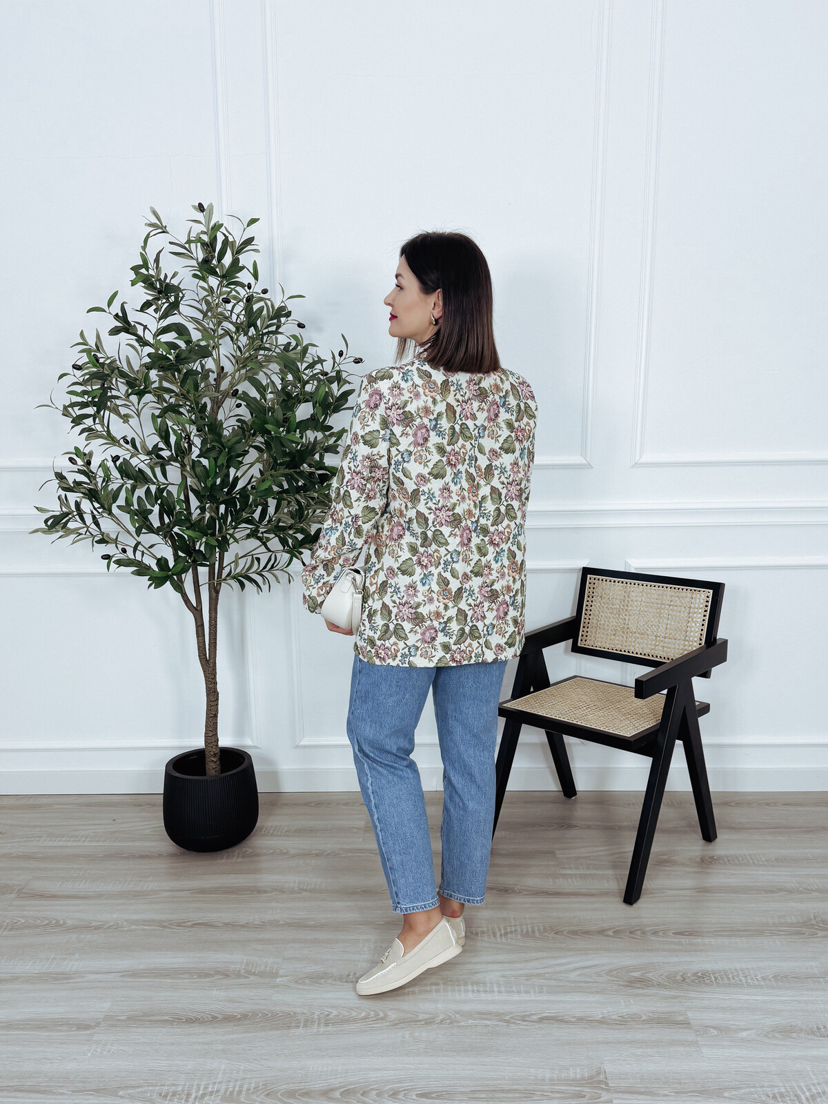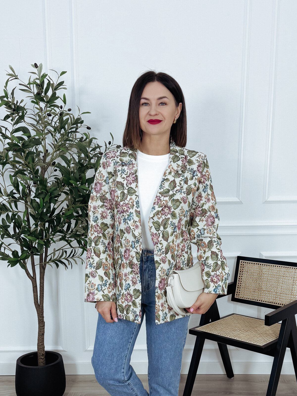 Marynarka żakardowa w kwiatowy motyw z poduszkami na ramionach, zapinana na ozdobny guzik. Połącz ją z ulubionymi spodniami lub spódnicą i stwórz niepowtarzalny wiosenny look. Model bez podszewki🖤