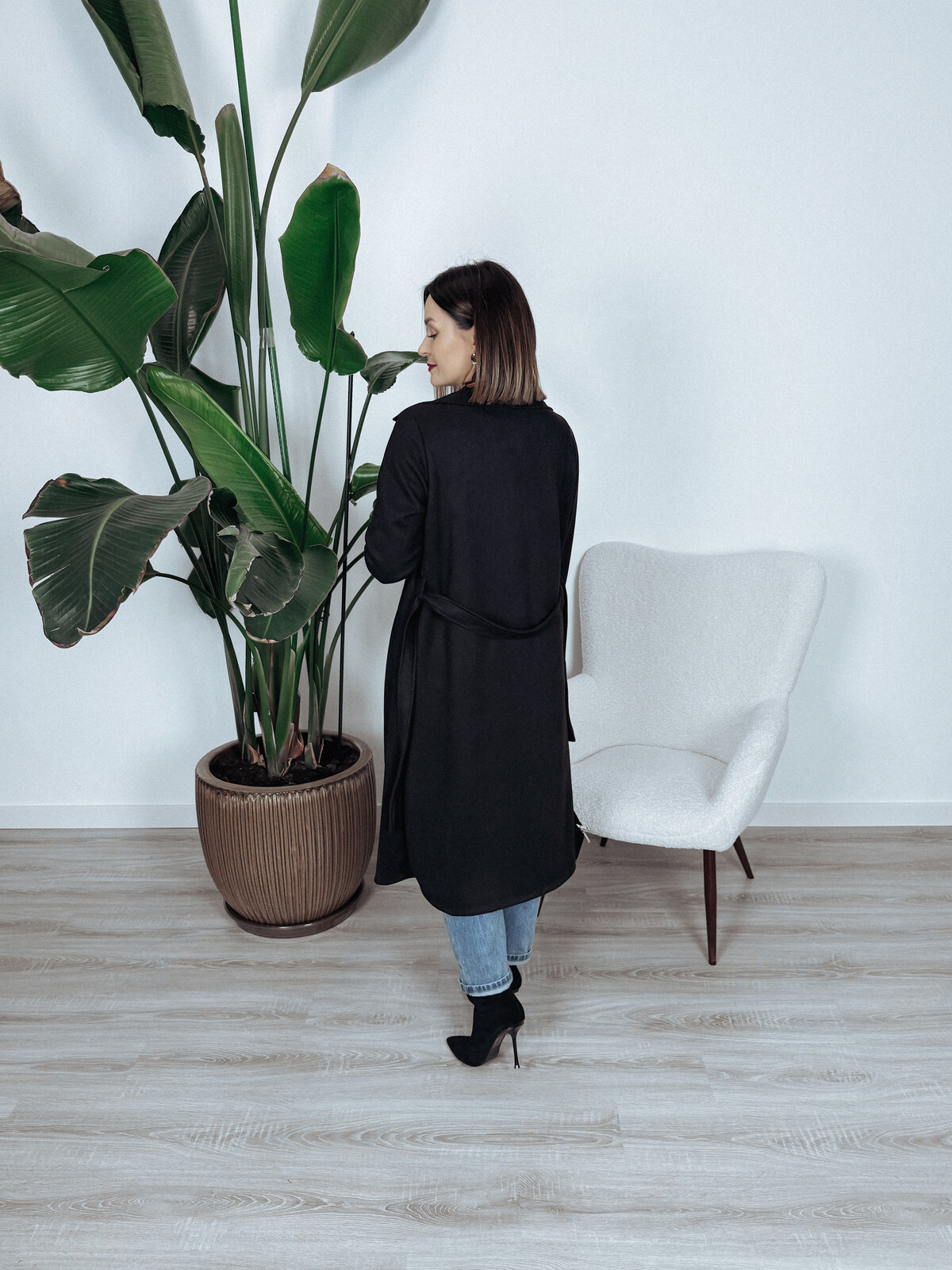 Zamszowy, jesienny płaszcz z kieszeniami bez podszewki. Dodatkowym atutem jest pasek, który dopasuje produkt do Twojej figury.🖤