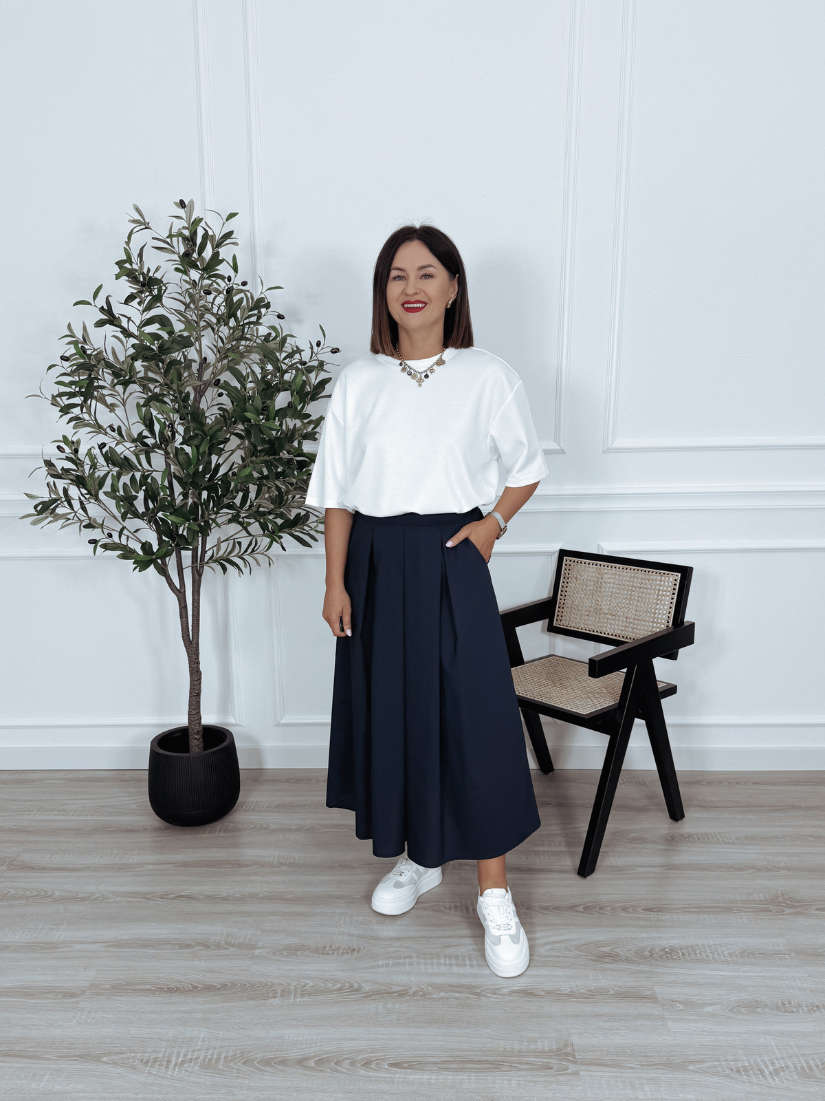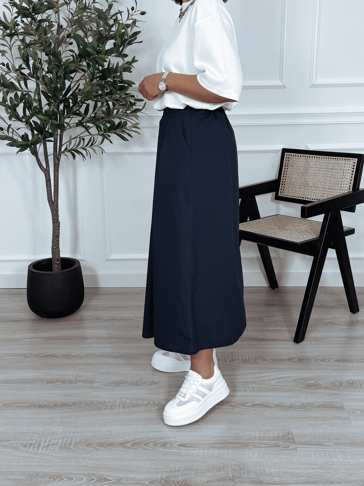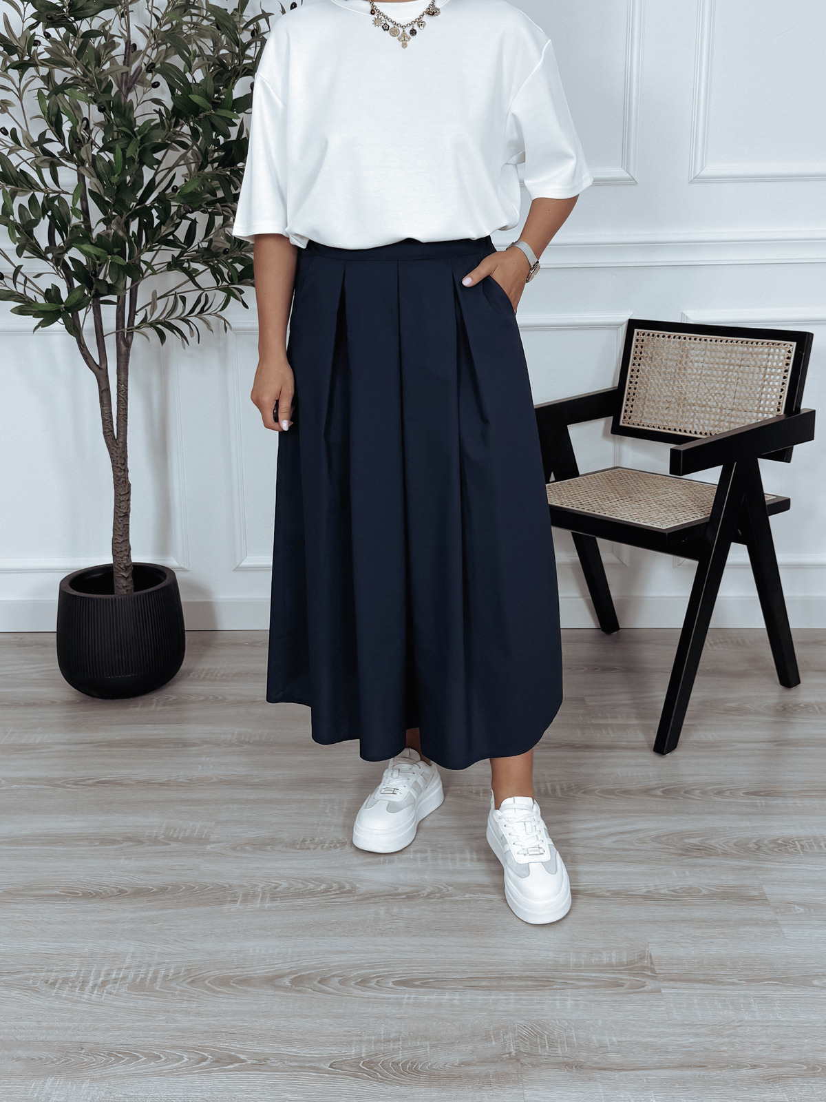 Spódnica uszyta ze 100% bawełny. W pasie elastyczna gumka z tyłu. Posiada kieszenie oraz szerokie plisy🖤