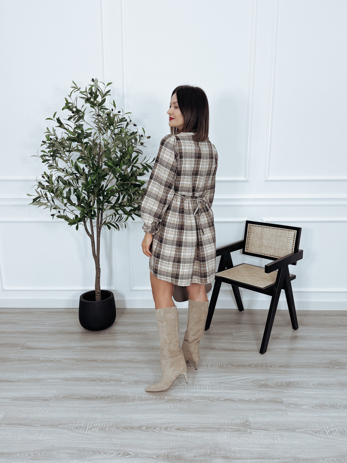 Sukienka premium polskiej produkcji w kratkę z wiązaniem beż GANNA