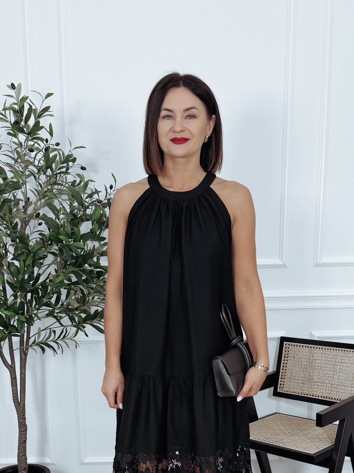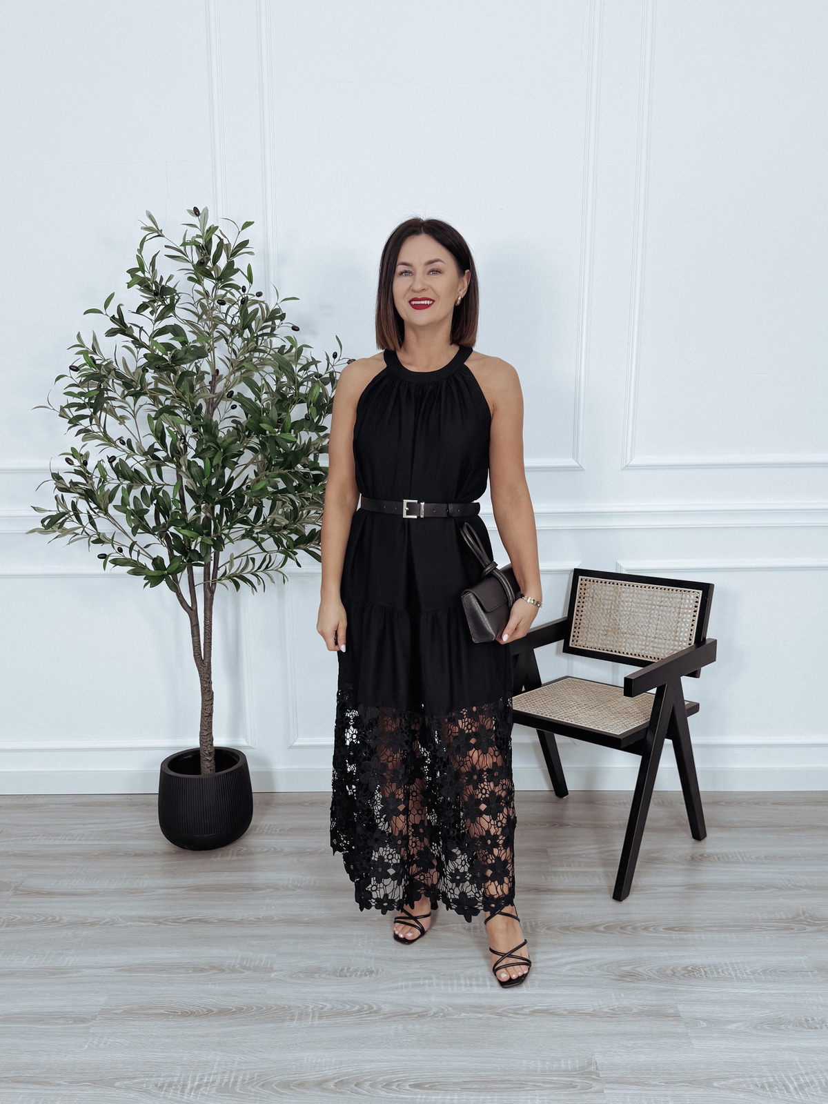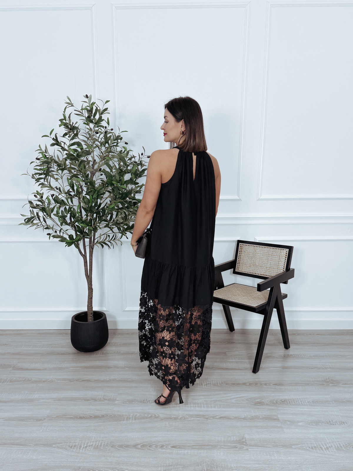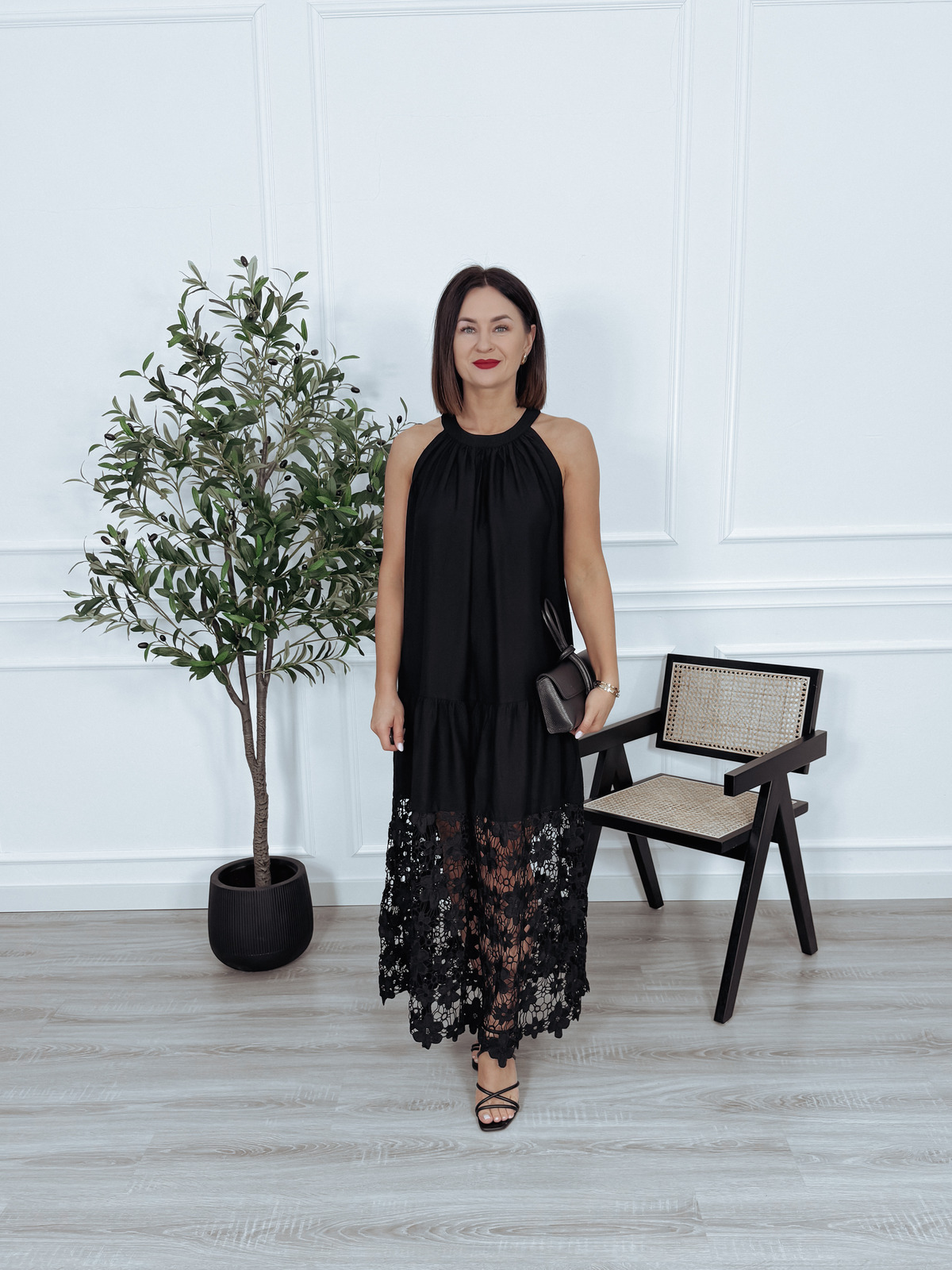 Niezwykła maxi sukienka z ozdobną gipirą na dole.  Model posiada podszewkę. Będzie idealna na eleganckie uroczystości i wesela🖤