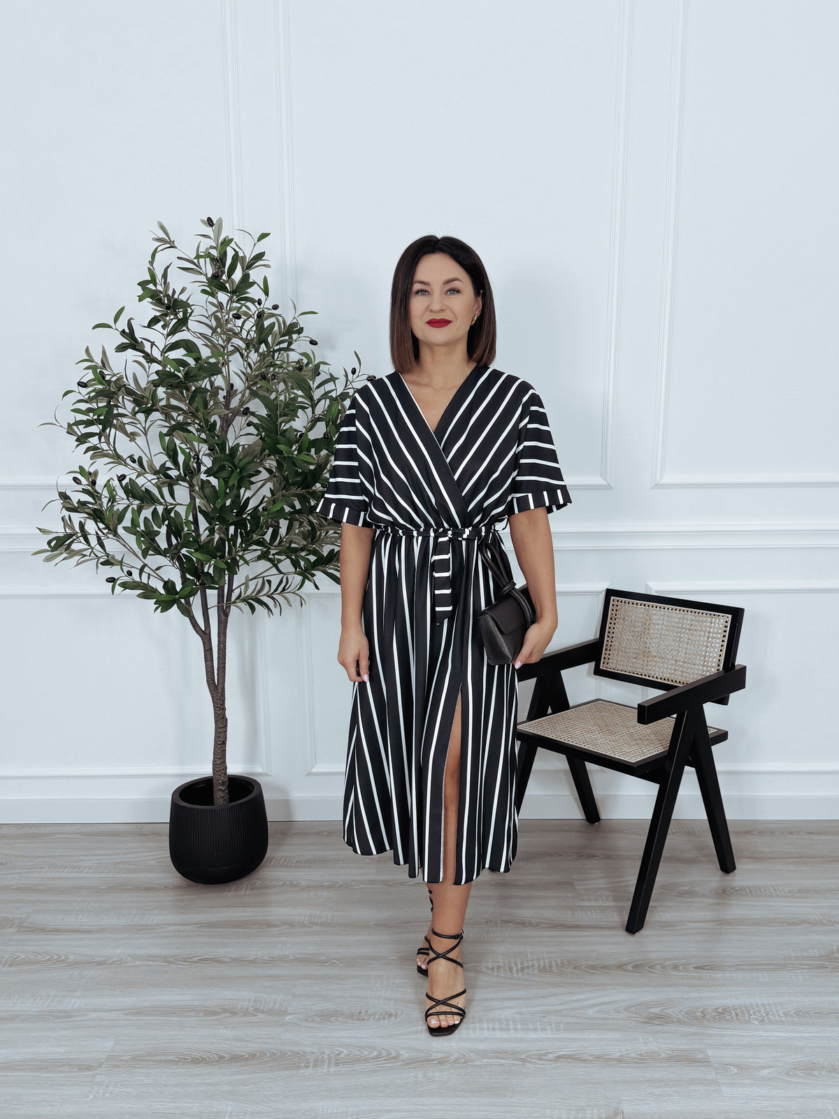 Model posiada z jednej strony rozcięcie oraz dekolt kopertowy.  Lekki, zwiewny materiał, który się nie gniecie oraz pięknie układa się w ruchu. W pasie gumka.