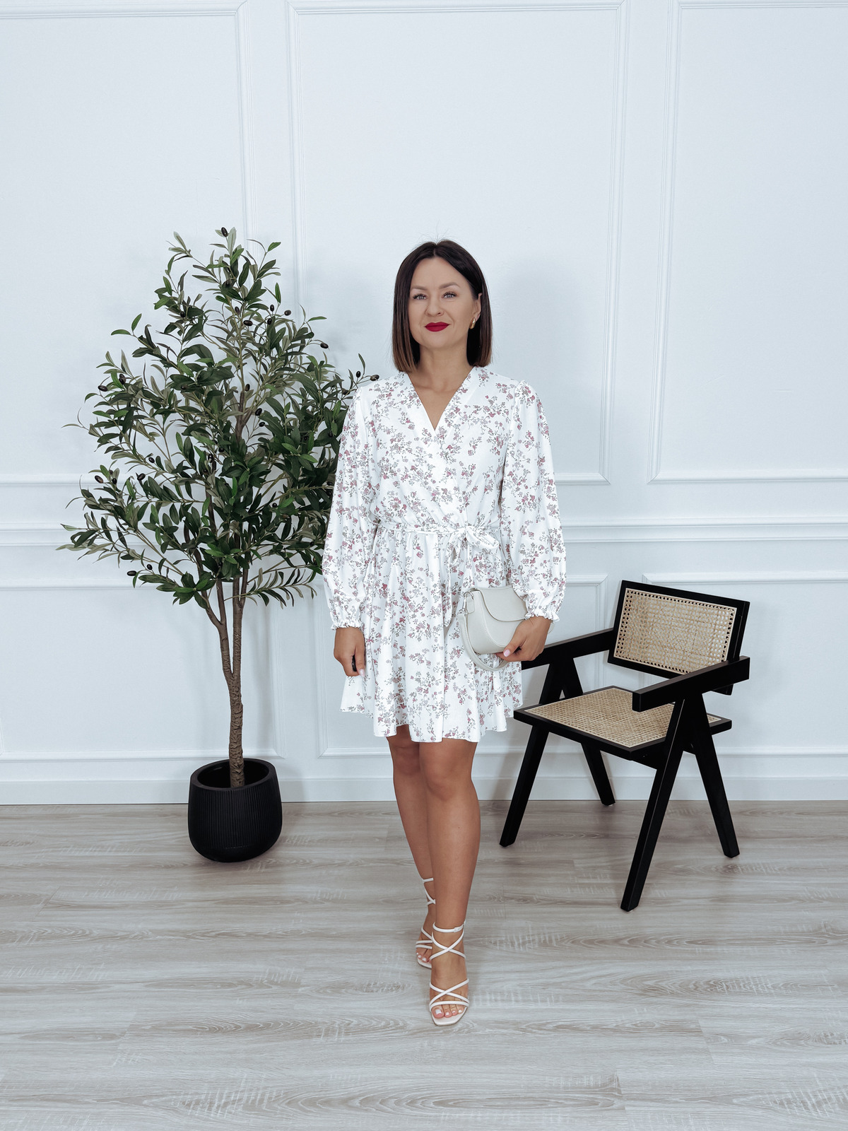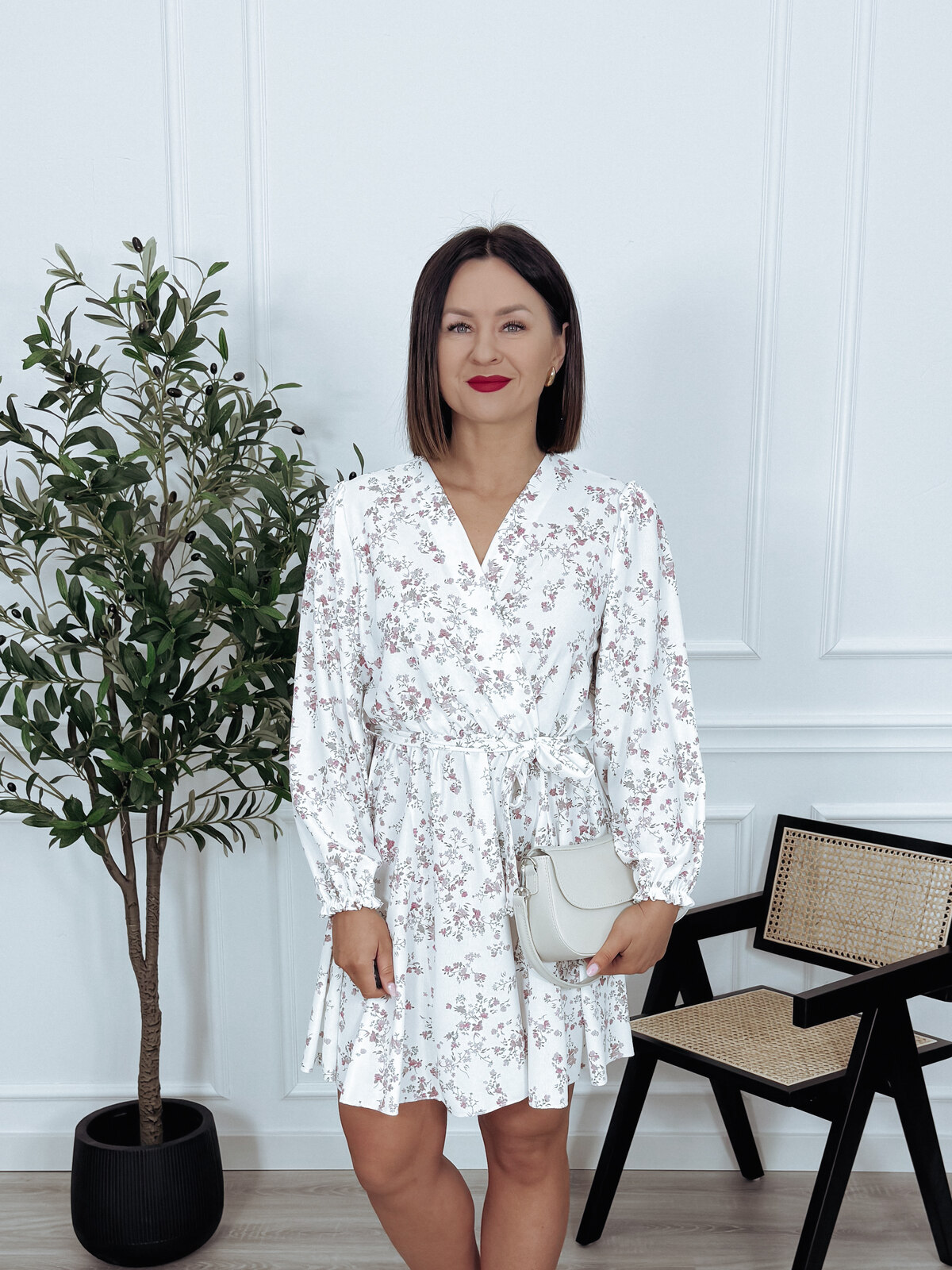 Sukienka z paskiem i gumką biała w kwiatki NASTIA