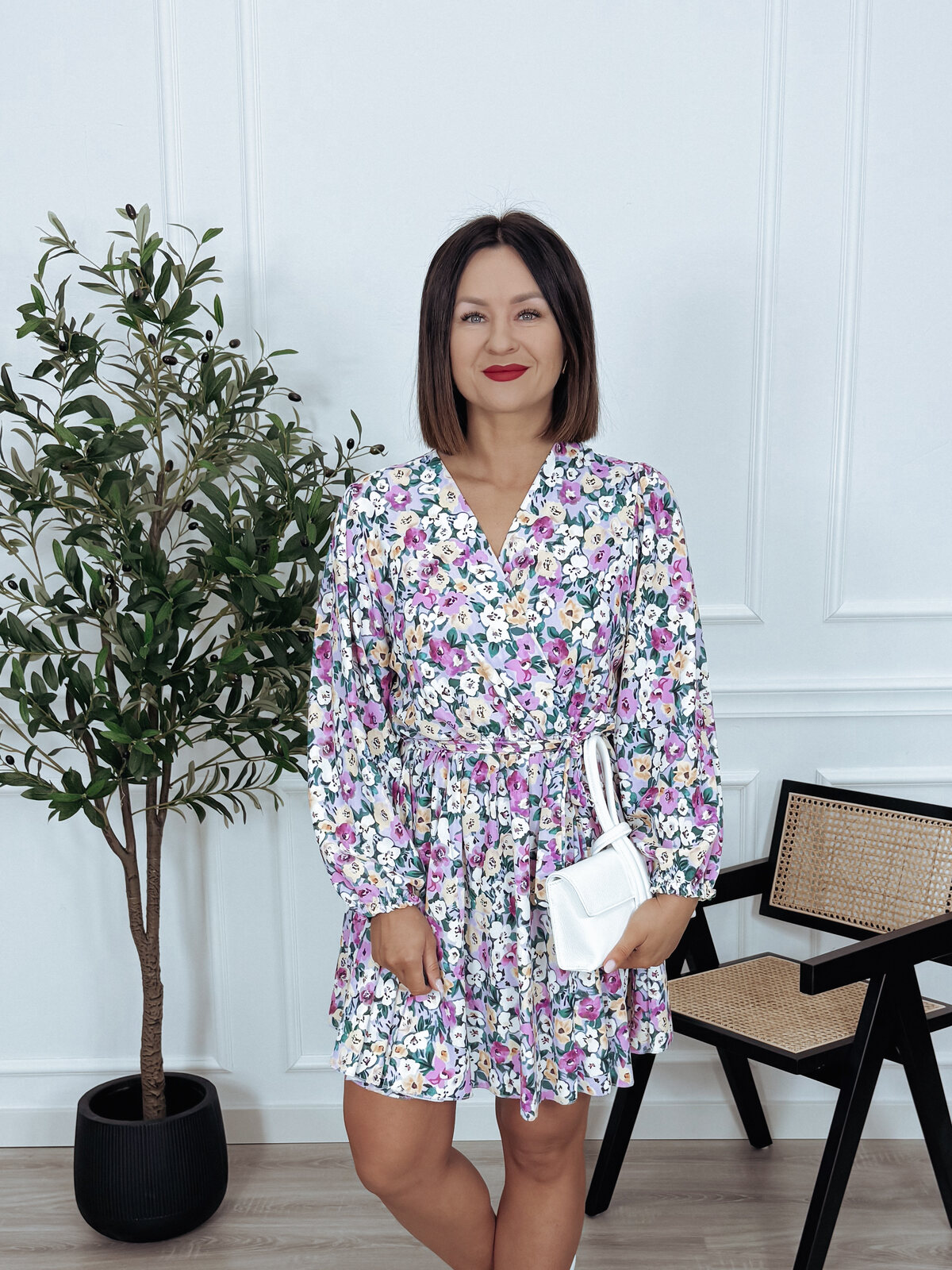 Sukienka z paskiem i gumką w pasie fioletowa w kolorowe kwiaty NASTIA