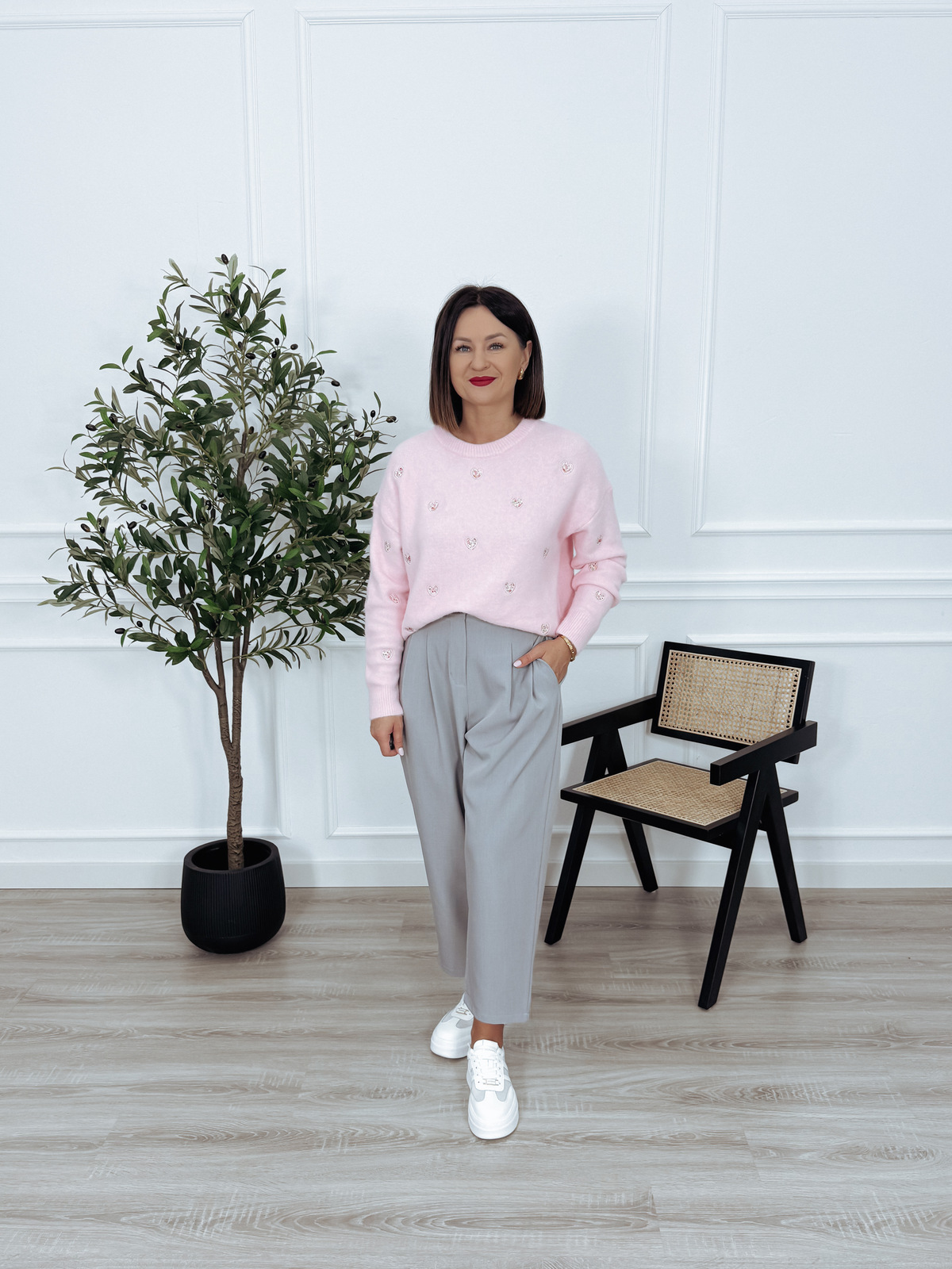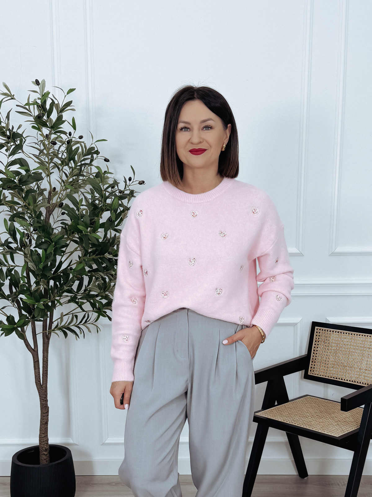 Wykonany z przyjemnej, miękkiej dzianiny sweter w subtelne serduszka. Must-have wiosennego sezonu!🖤